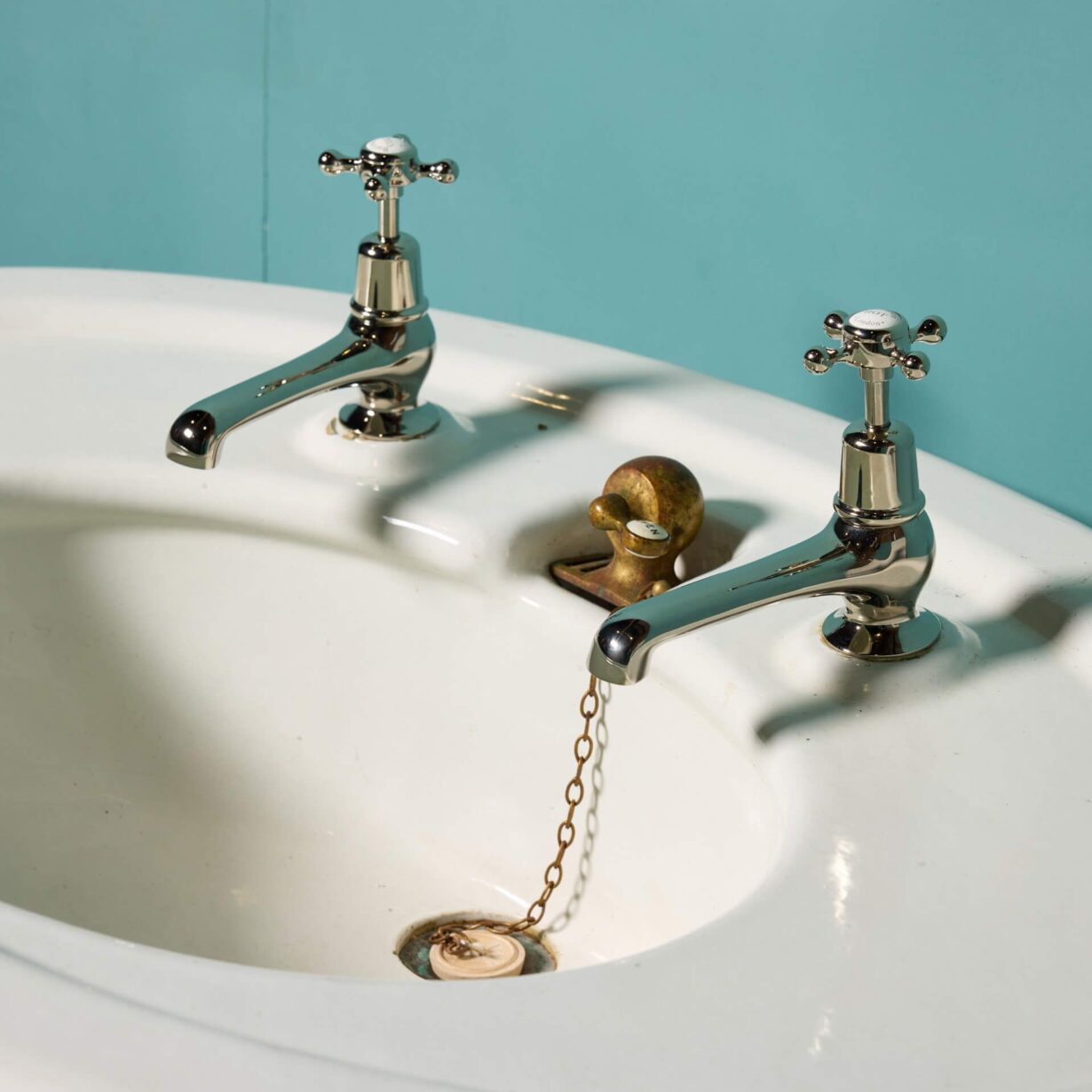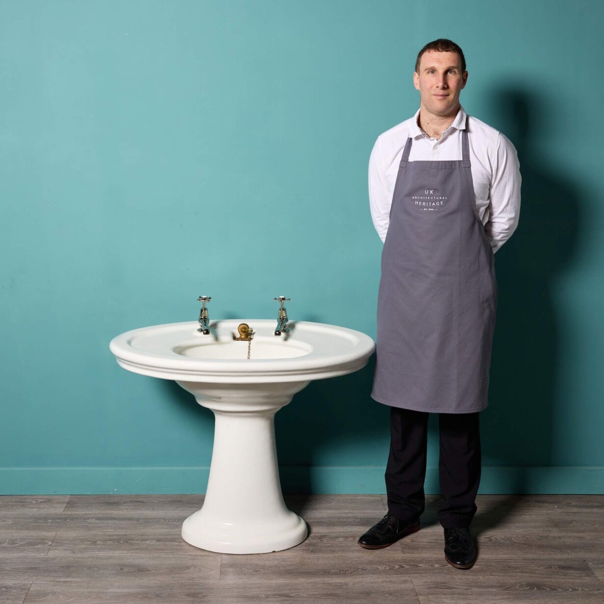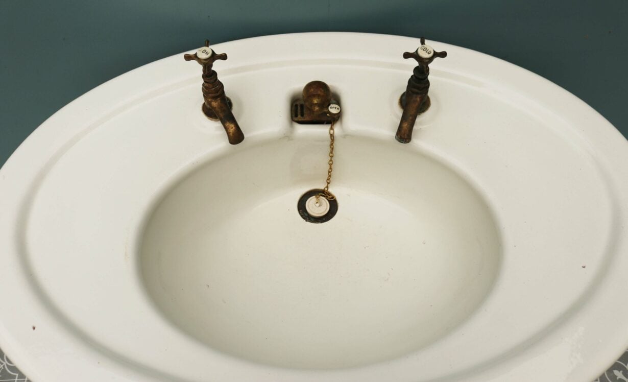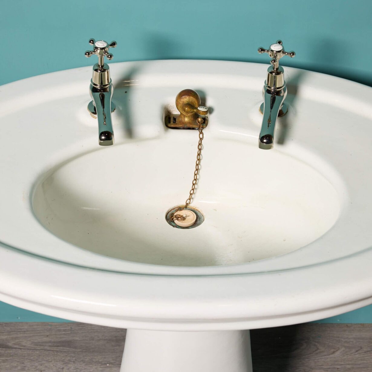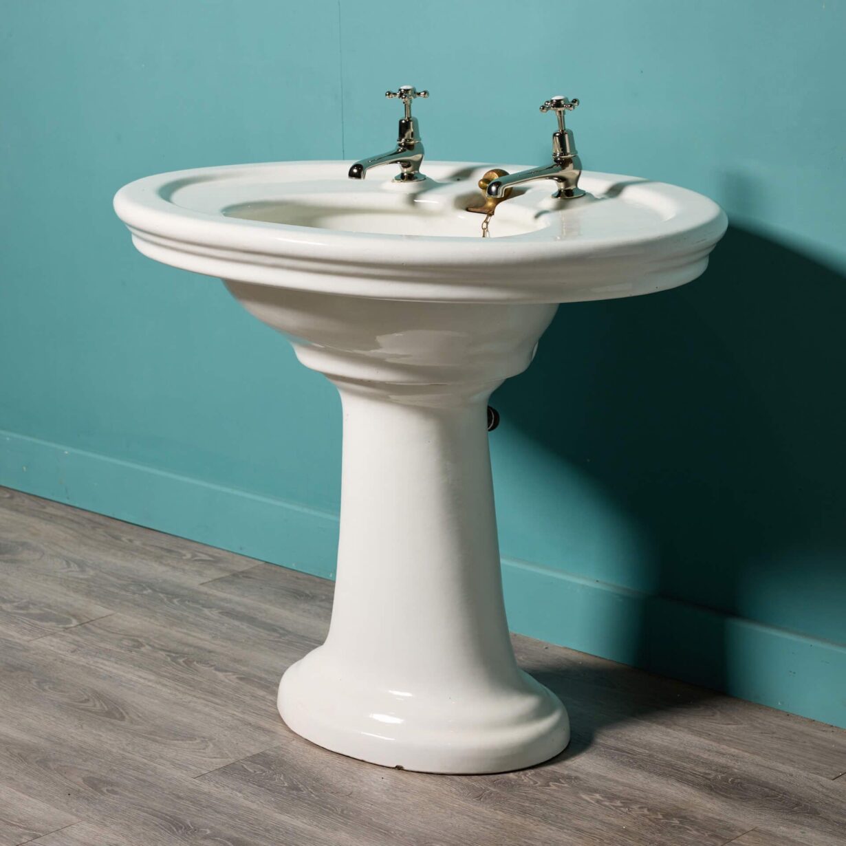 back to topAn elegant antique oval shaped pedestal sink originating from England. This quaint 1920s stoneware sink is of an impressive scale. The pleasing basin, thickly cast pedestal and wide rim make this unusual freestanding sink perfect for a main bathroom of period and contemporary properties alike.