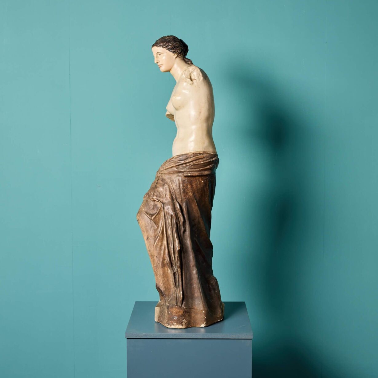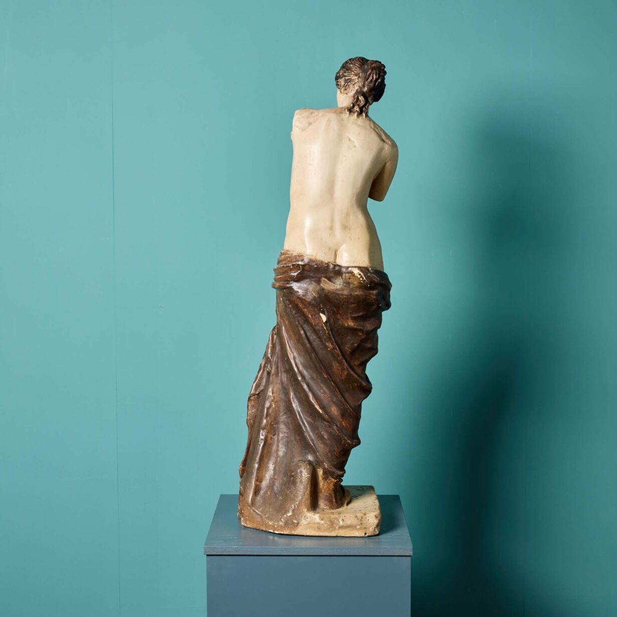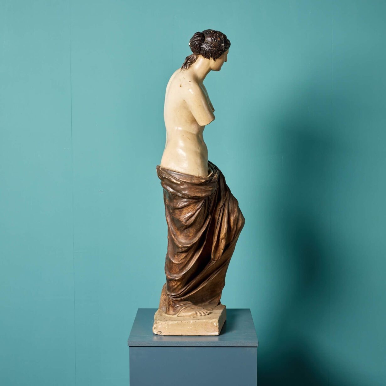 She is a little under half life-size, making her a perfect scale for interior display on a pedestal or column. The Greek Goddess is modelled as she is in the original, standing half nude, covered in swathes of drapery from the waist down and her head detailed with ribbons of hair, elegantly swept into a bun and applied with brown paint.
