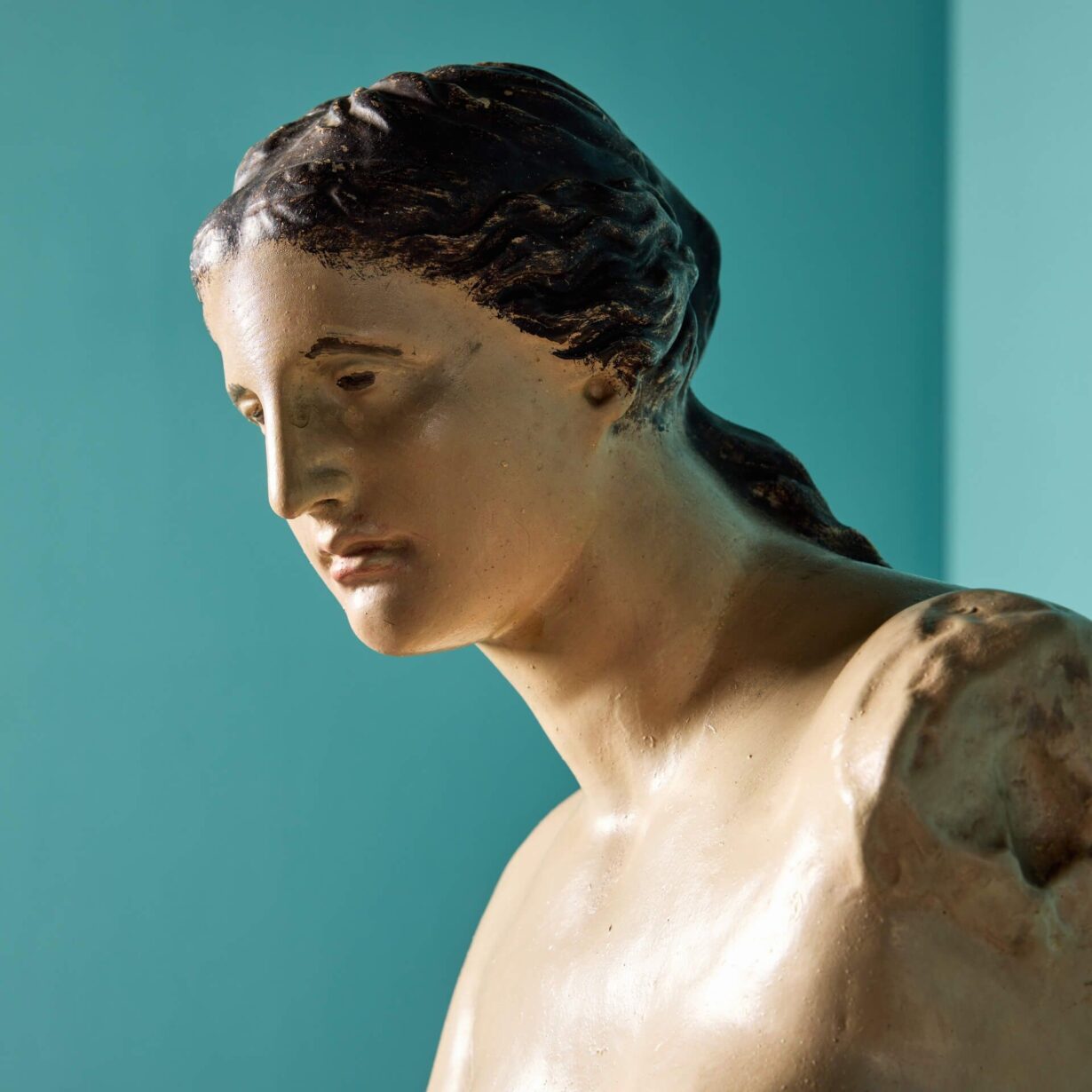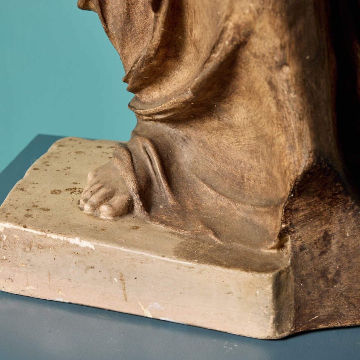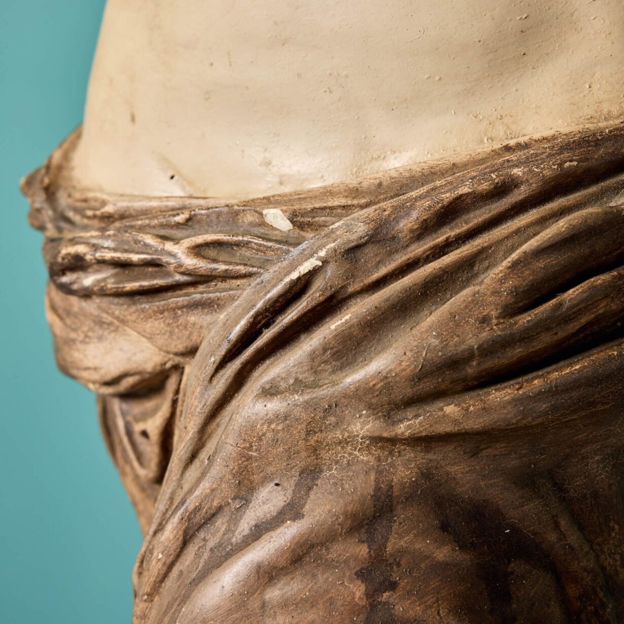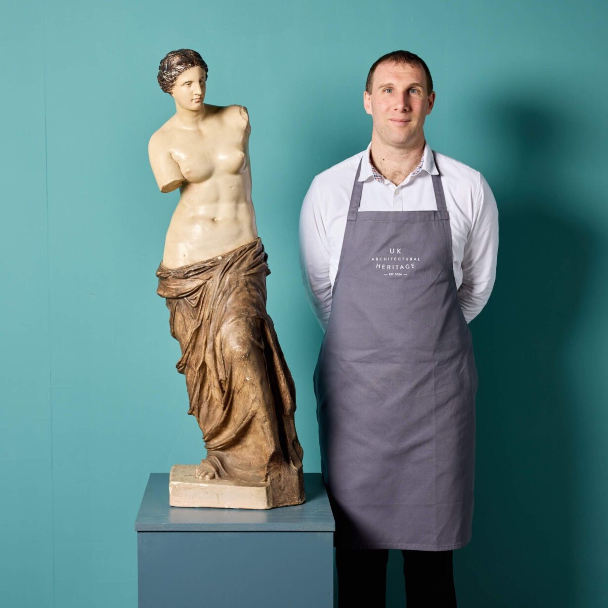 She is a little under half life-size, making her a perfect scale for interior display on a pedestal or column. The Greek Goddess is modelled as she is in the original, standing half nude, covered in swathes of drapery from the waist down and her head detailed with ribbons of hair, elegantly swept into a bun and applied with brown paint.