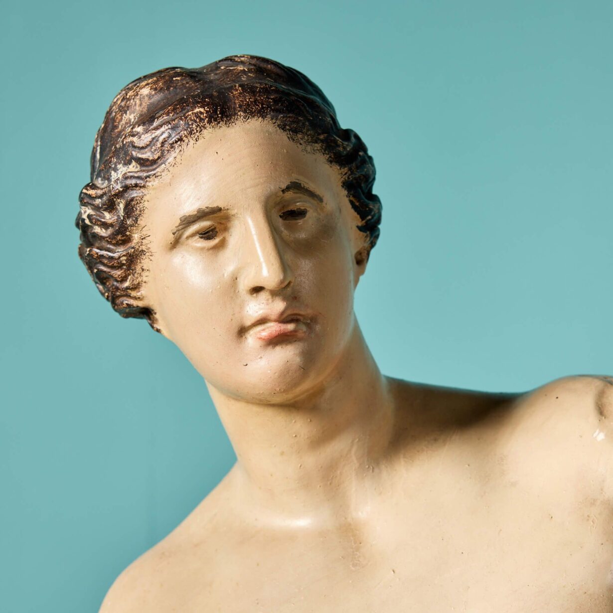 back to topAn early 20th century classical antique painted plaster statue of the Venus De Milo, after the antique. Also known as Aphrodite of Melos, this sculpture is a scale plaster depiction of the 2-metre ancient Greek marble original situated in the Louvre Museum, Paris.