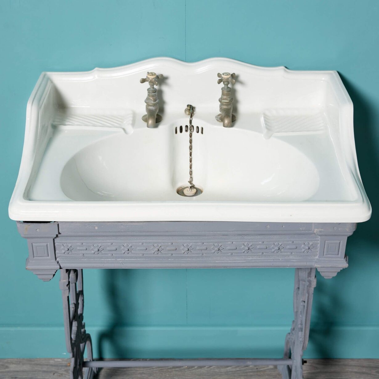 This sink sees a porcelain basin with a shaped splash back and decorative soap dishes above an ornately cast iron standing bracket with a paint finish.