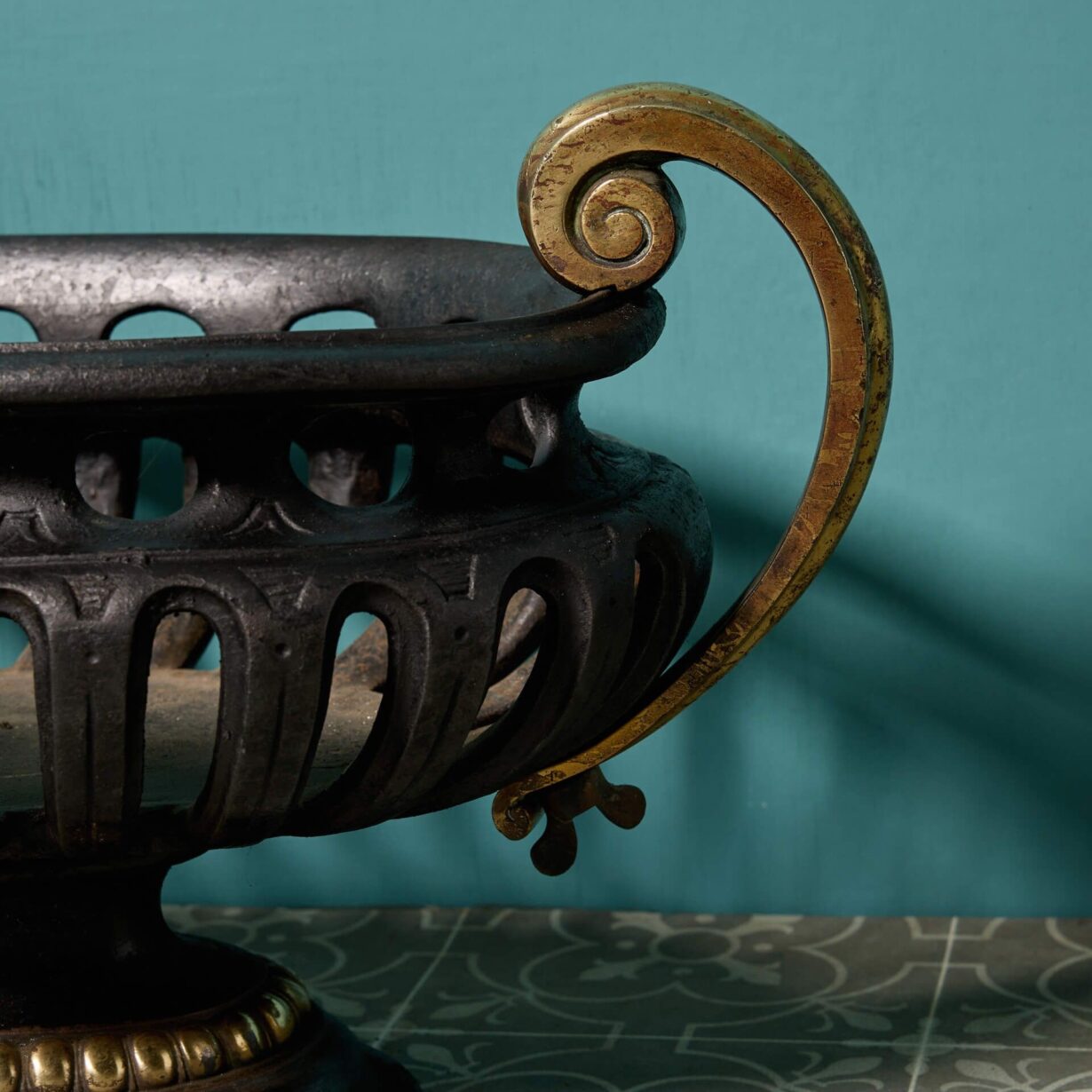 Dating from the Regency period, this brass fire grate is evocative of the period, detailed with striking gold brass handles on either end.