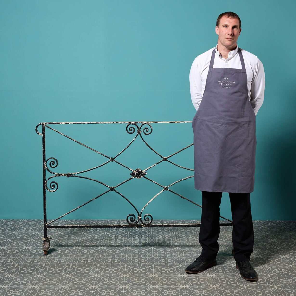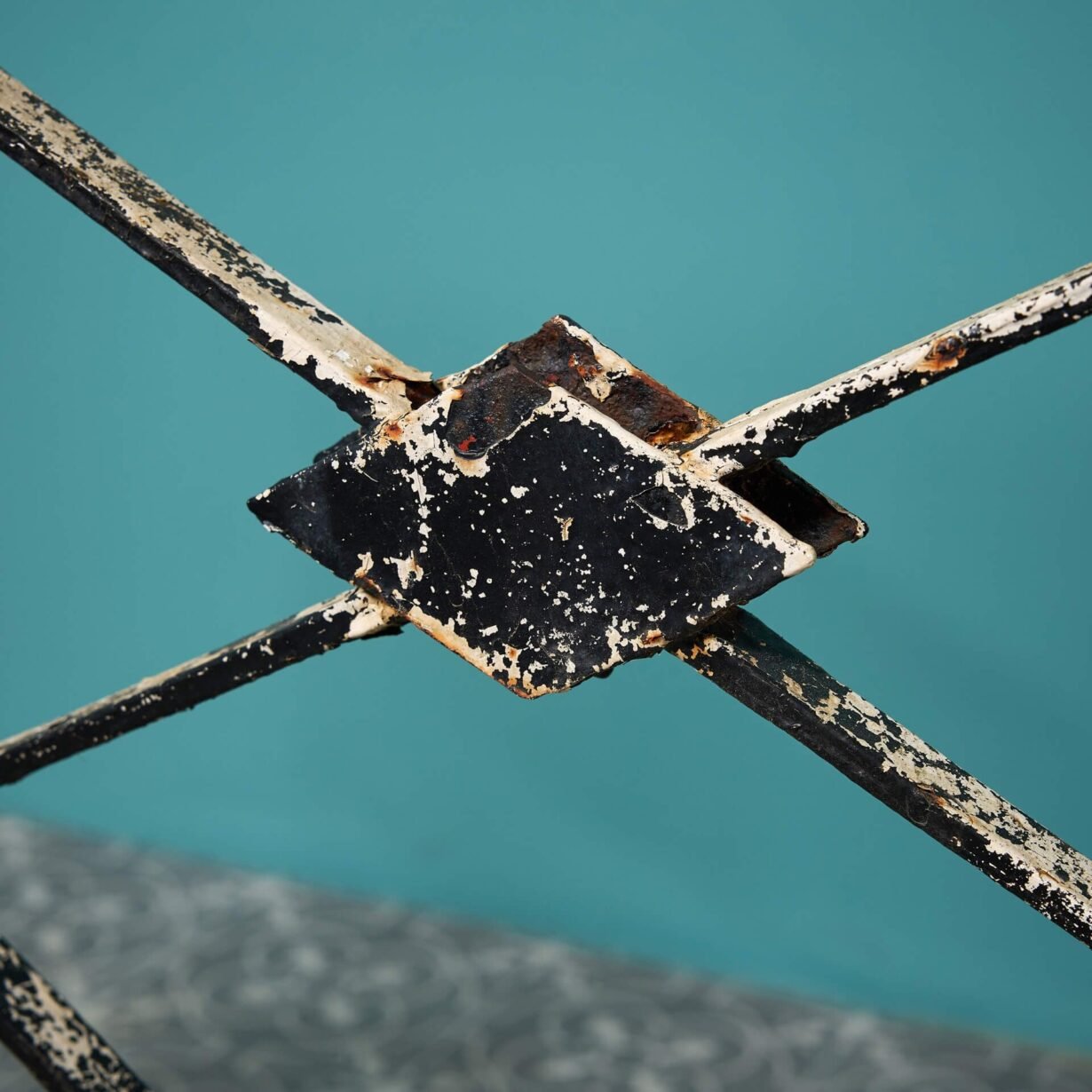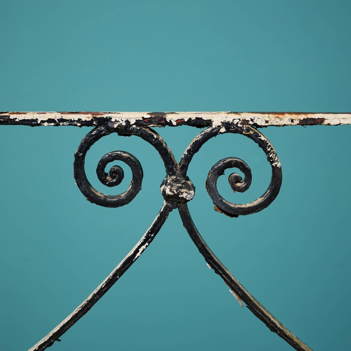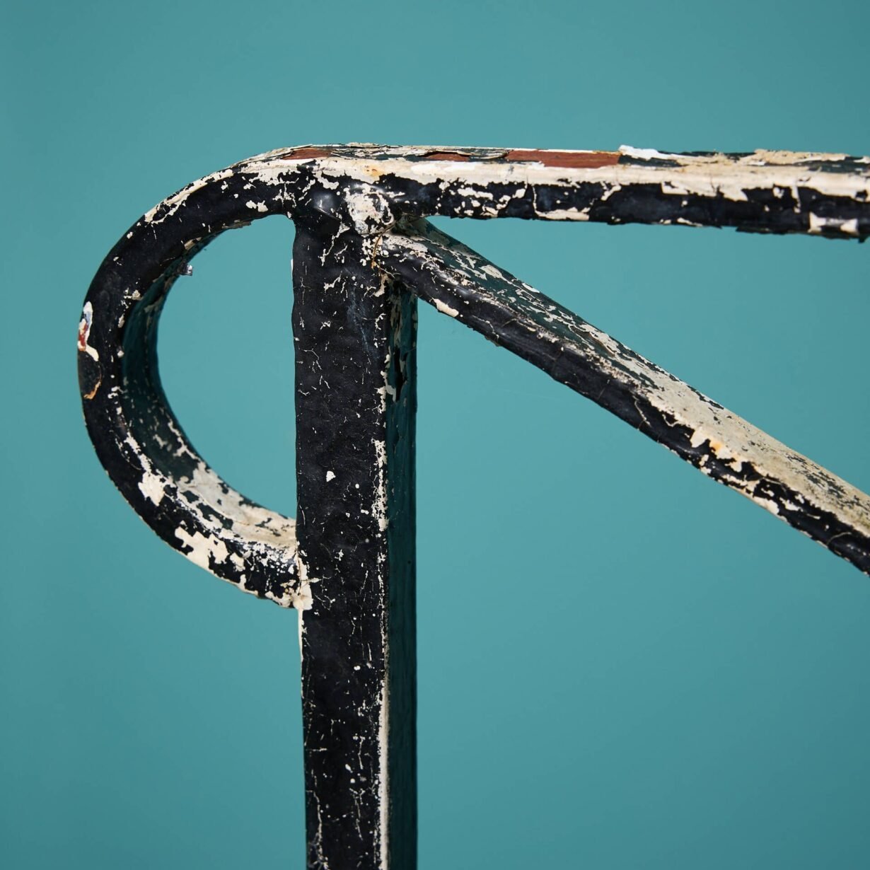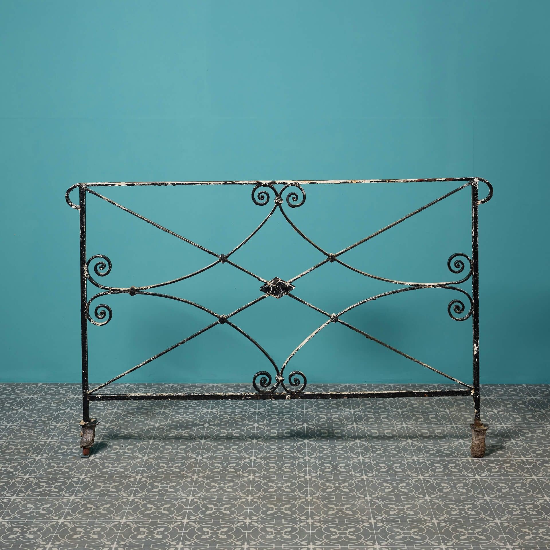back to topAn antique Regency style wrought iron railing, reclaimed from a Cheltenham townhouse; one of two we have for sale. Finished with old, flaking paint, this handcrafted metal railing has an aged look that’s steeped in history, making a stunning decorative piece in your garden.