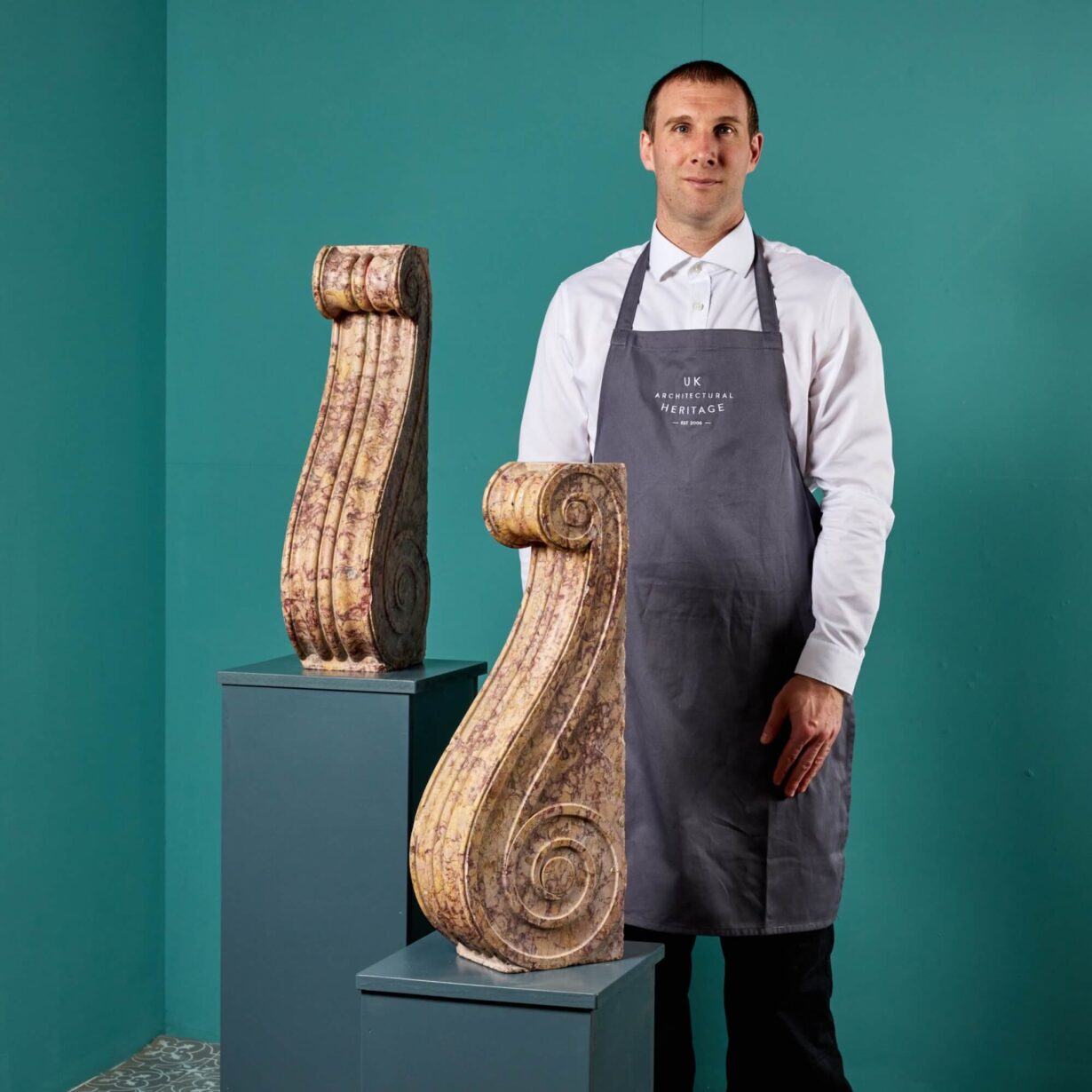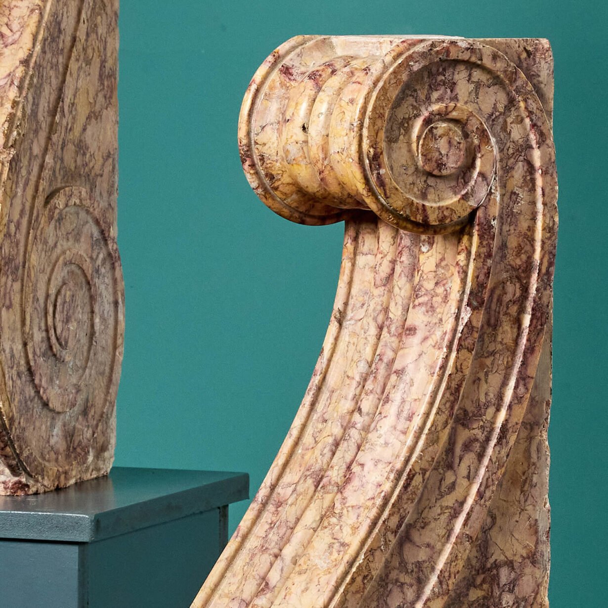 back to topA pair of large decorative corbels beautifully crafted in brocatelle marble. Dating from the 1850s, these marble corbels were likely once used as wall decoration or part of a large fireplace in a prestigious interior during the 19th century. Today, they make a striking pair of historical objects for an interior with their scrolling, neoclassical look and highly decorative brocatelle marble craftsmanship.