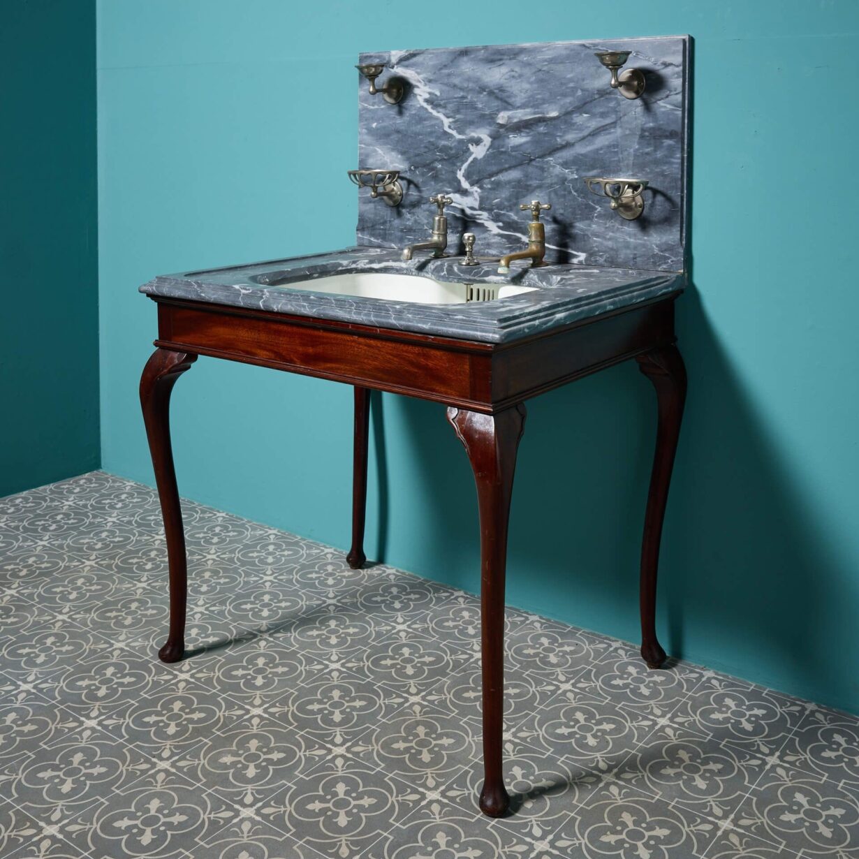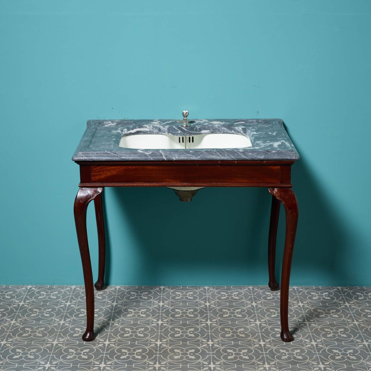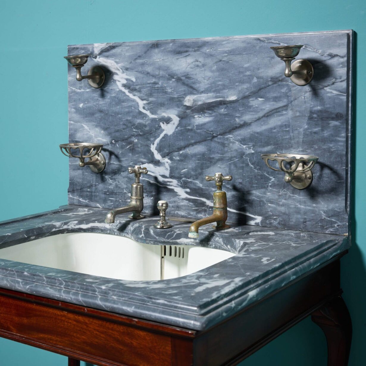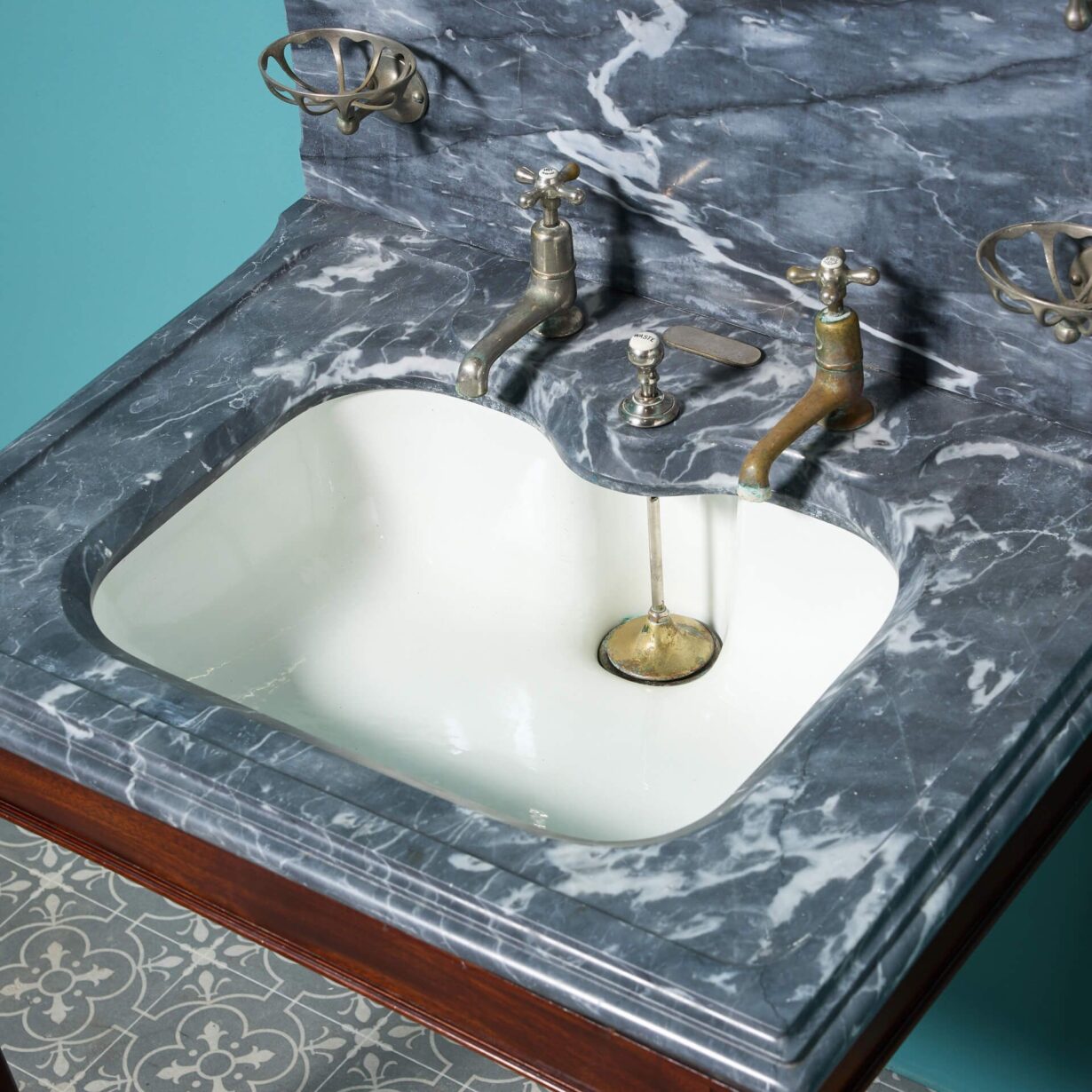 back to topA stunning antique Shanks and Co. marble basin with mahogany stand. Dating to circa 1890, this antique sink features a dove grey marble washstand with an under-mounted porcelain plunger basin on a mahogany stand with cabriole legs and nickel plated fittings.