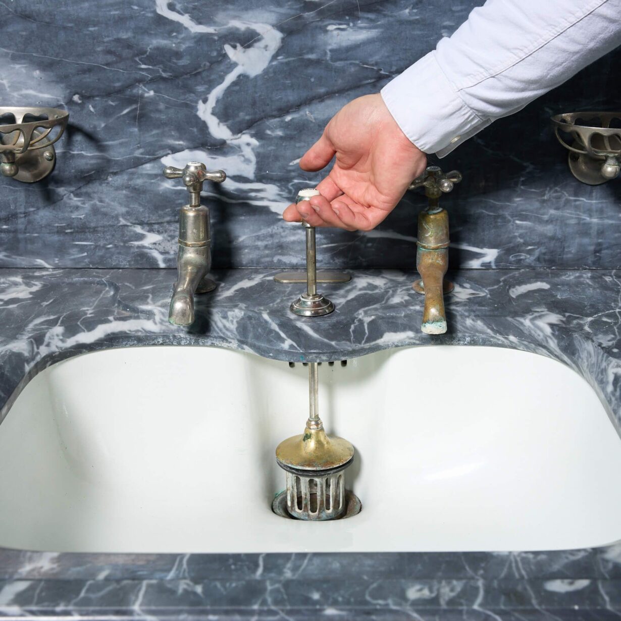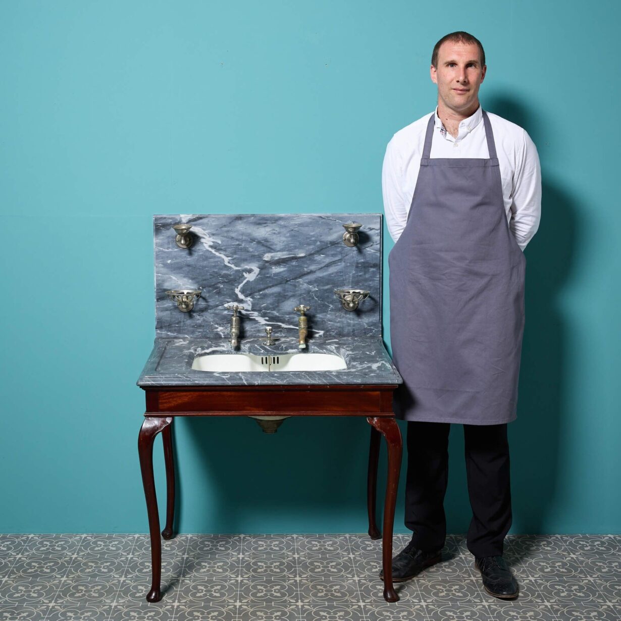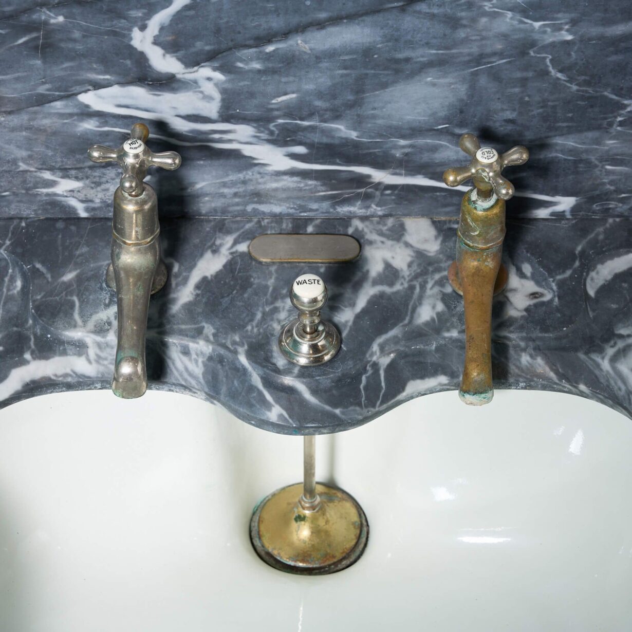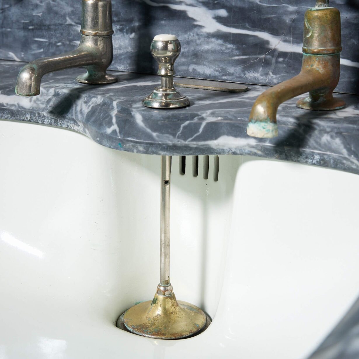 back to topA stunning antique Shanks and Co. marble basin with mahogany stand. Dating to circa 1890, this antique sink features a dove grey marble washstand with an under-mounted porcelain plunger basin on a mahogany stand with cabriole legs and nickel plated fittings.
