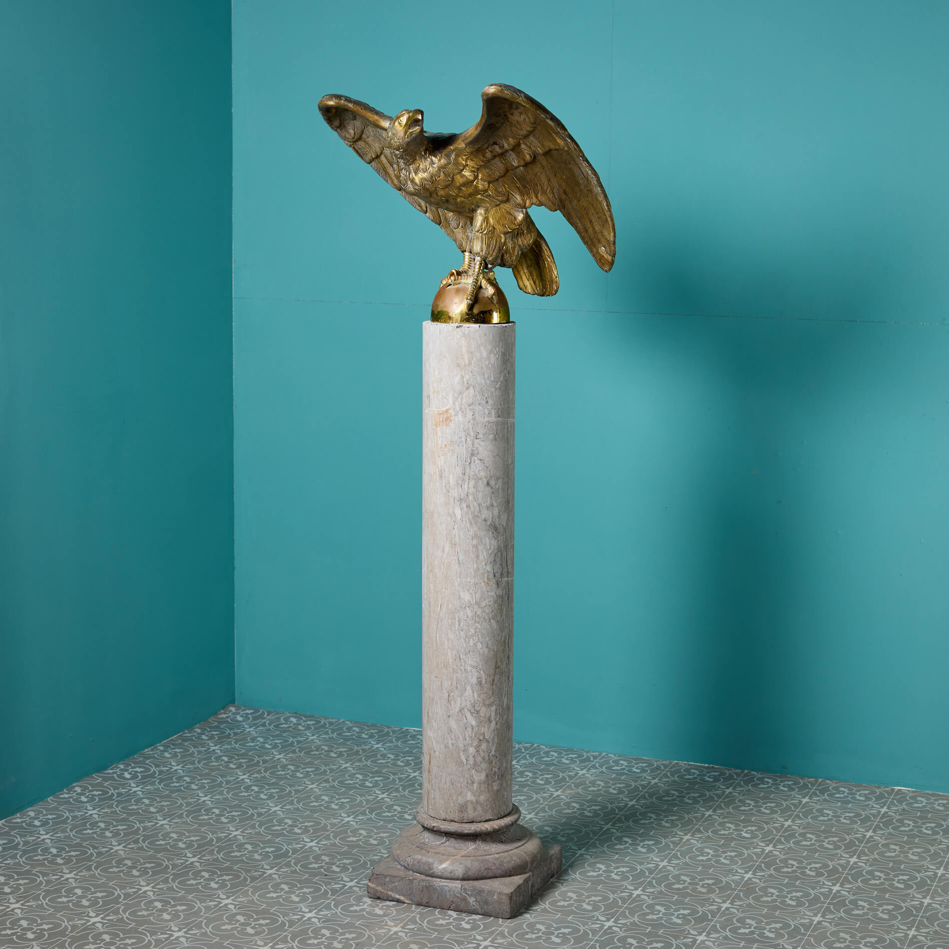 back to topAn impressive 19th century solid gilt brass eagle statue upon a grey Ashburton marble column. This striking figurine is an imposing piece, best situated to a spacious interior alcove, hallway or drawing room so that its beauty can be observed from every angle. The gilt brass eagle is of beautiful scale and incredibly lifelike with intricate markings detailing each and every feather. It perches in a prominent pose with wings outstretched, its head turned to the right and beak open as it appears to call.