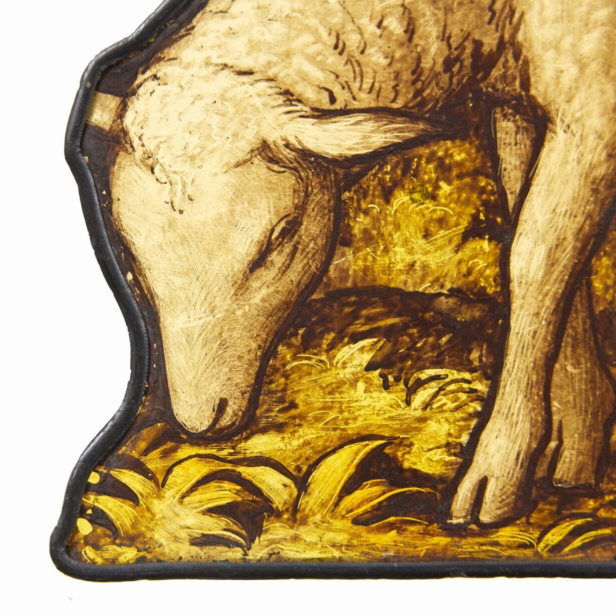 A beautifully handpainted antique stained glass hanging panel of a sheep grazing, circa 1870. Hang in a window or in front of a light source to bring its colours and character to life.