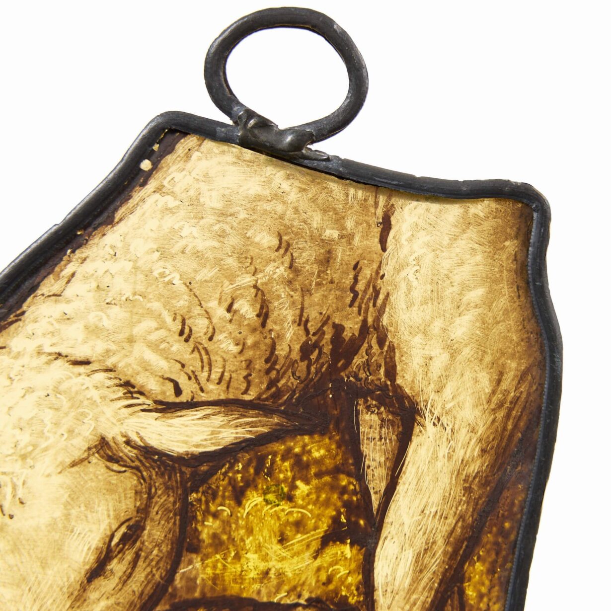 back to topA beautifully handpainted antique stained glass hanging panel of a sheep grazing, circa 1870. Hang in a window or in front of a light source to bring its colours and character to life.