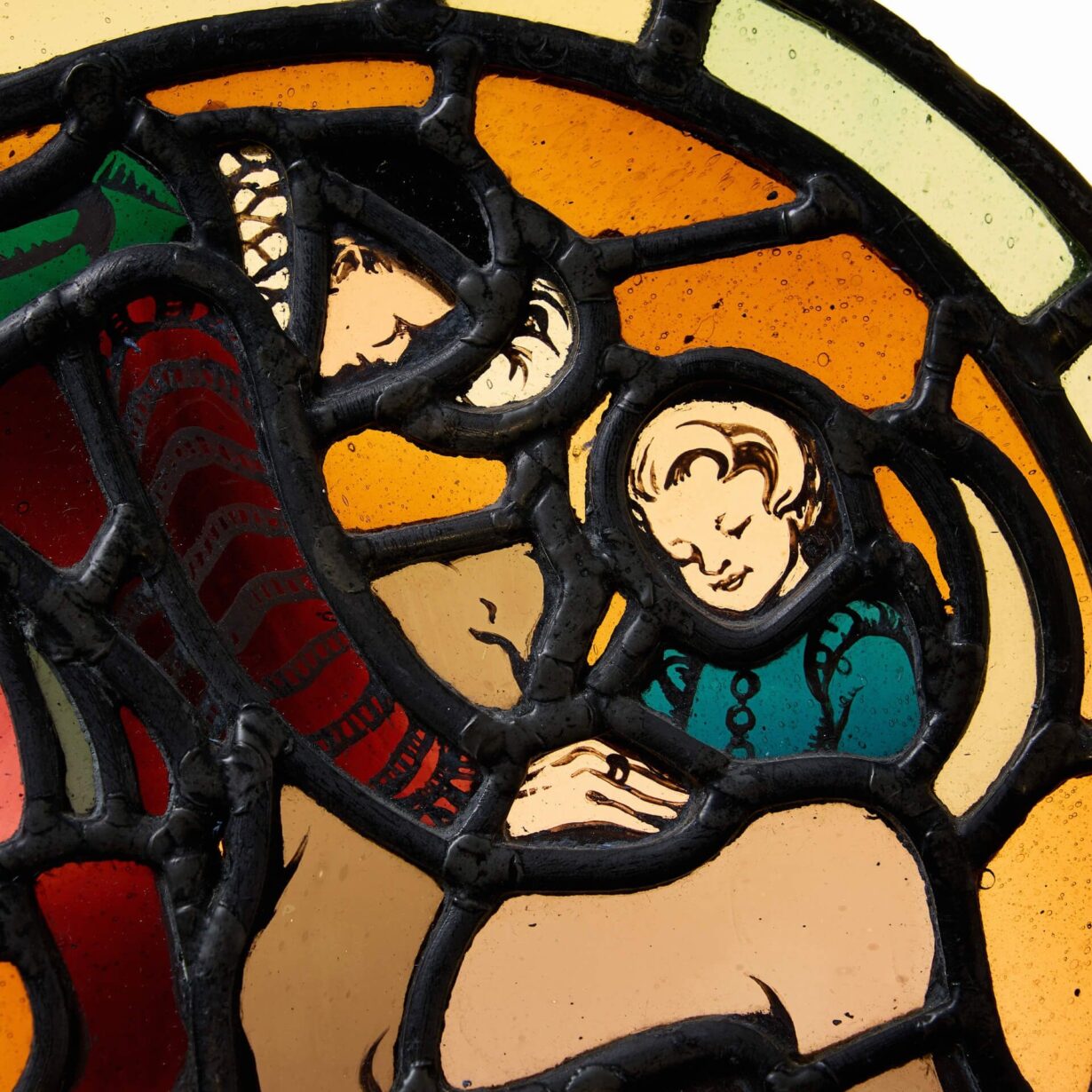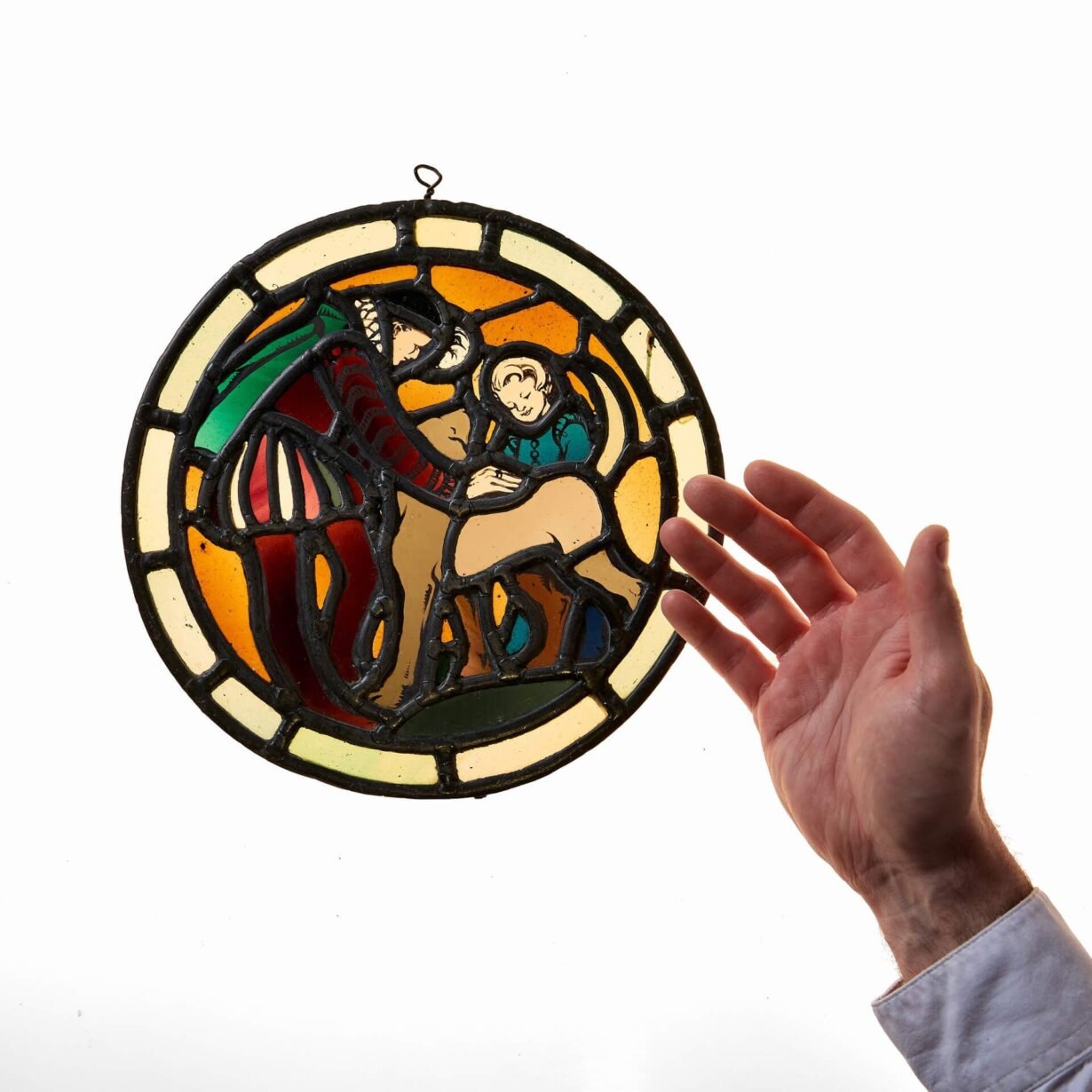 back to topA small antique stained glass roundel depicting a man and child with a dog, dating back to the early 20th century.