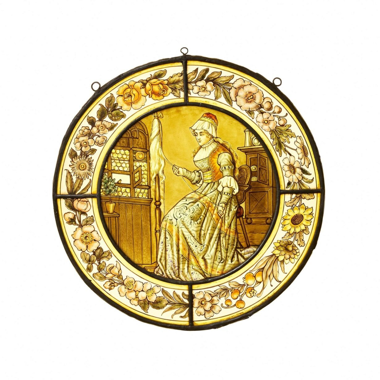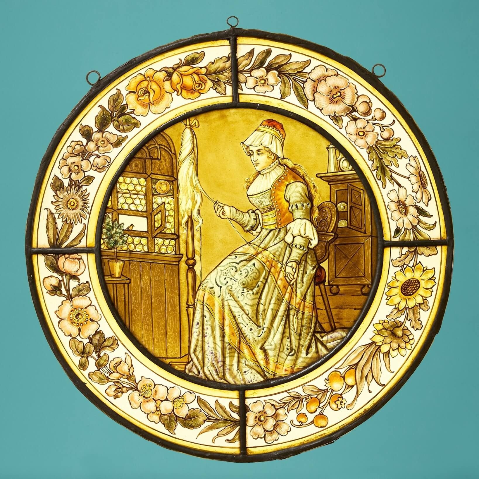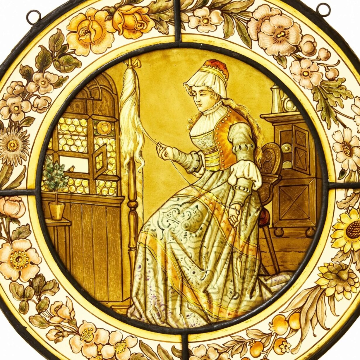 back to topAn antique stained glass window depicting a Victorian woman spinning yarn. Hand-painted stylised flowers and a vibrant yellow border surround the woman while she effortlessly spins the yarn. Her dress is a pale blue and gold displaying wealth and elegance.