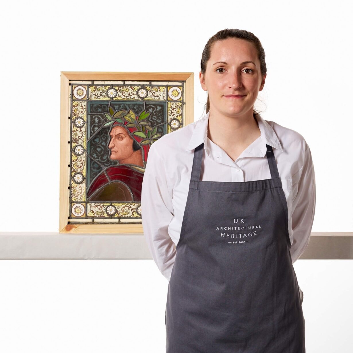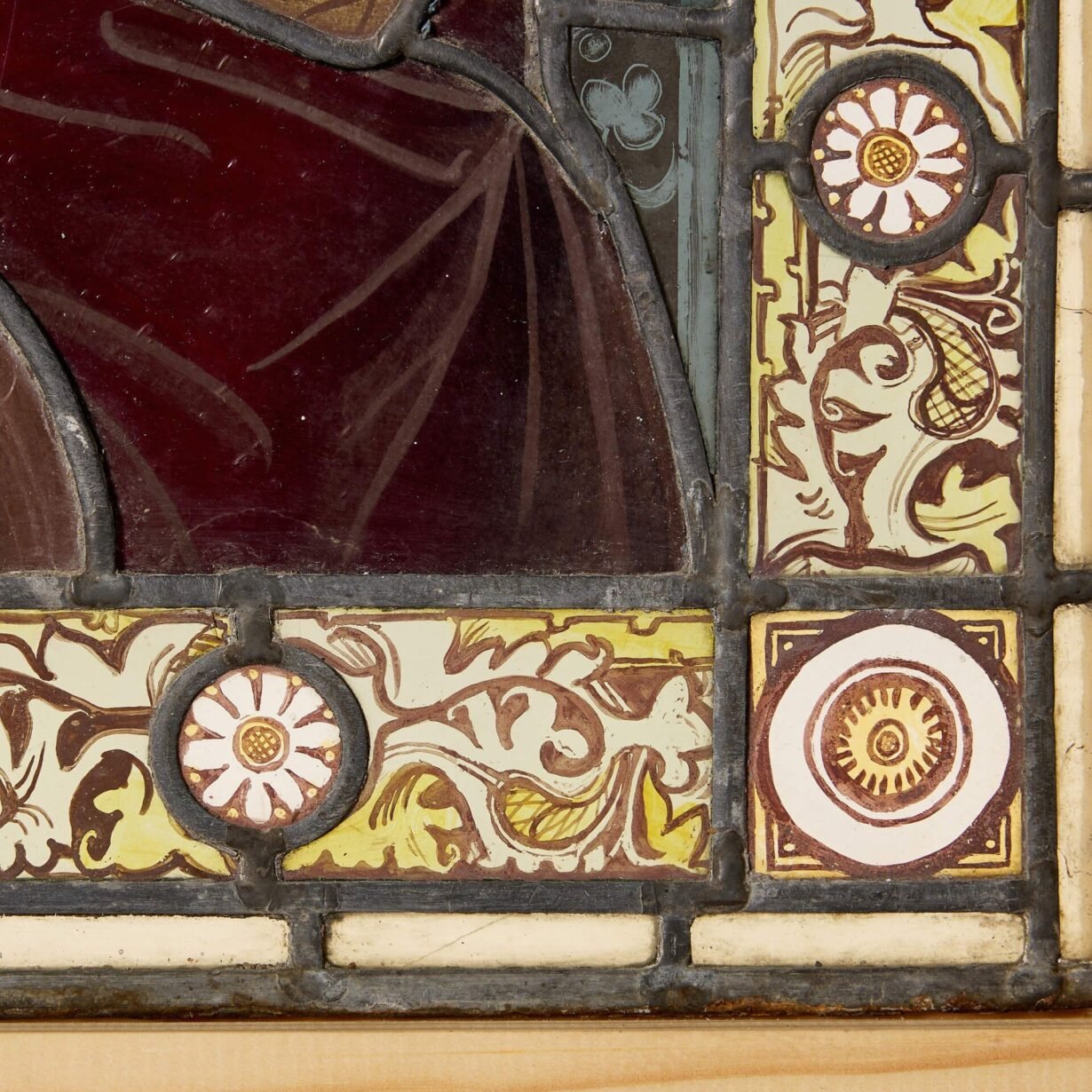 He is captured here in stained glass as he is often portrayed in art and sculpture, wearing a bright red cloak and cap, decorated with a laurel wreath as a symbol of his prominent status as a poet. Thanks to its vivid colour and striking subject, this antique stained glass window is certain to become a feature work of art in any setting, be that a contemporary townhouse or period cottage.