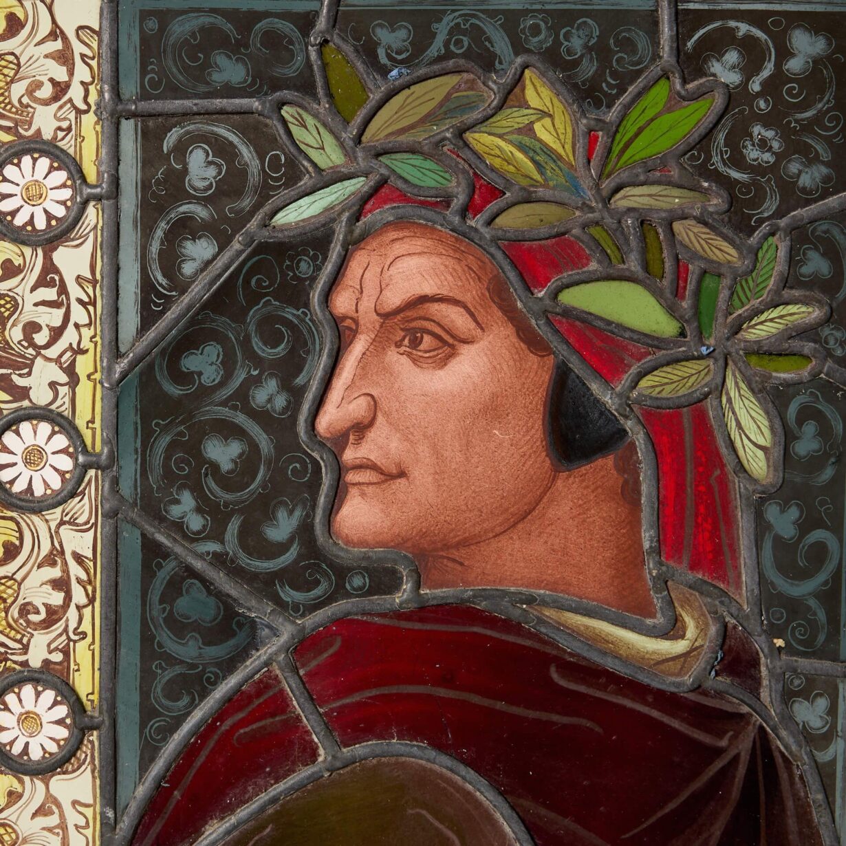 back to topA vibrant and brilliantly detailed mid 19th century antique stained glass window depicting Dante Alighieri, famed late 13th to early 14th century Italian philosopher, writer and poet.