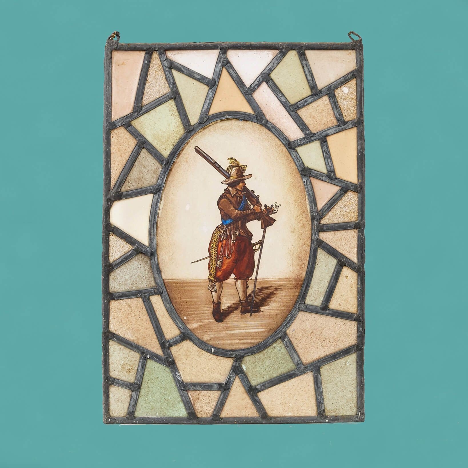 back to topAn antique mid-19th century stained glass window hanging depicting a musketeer.