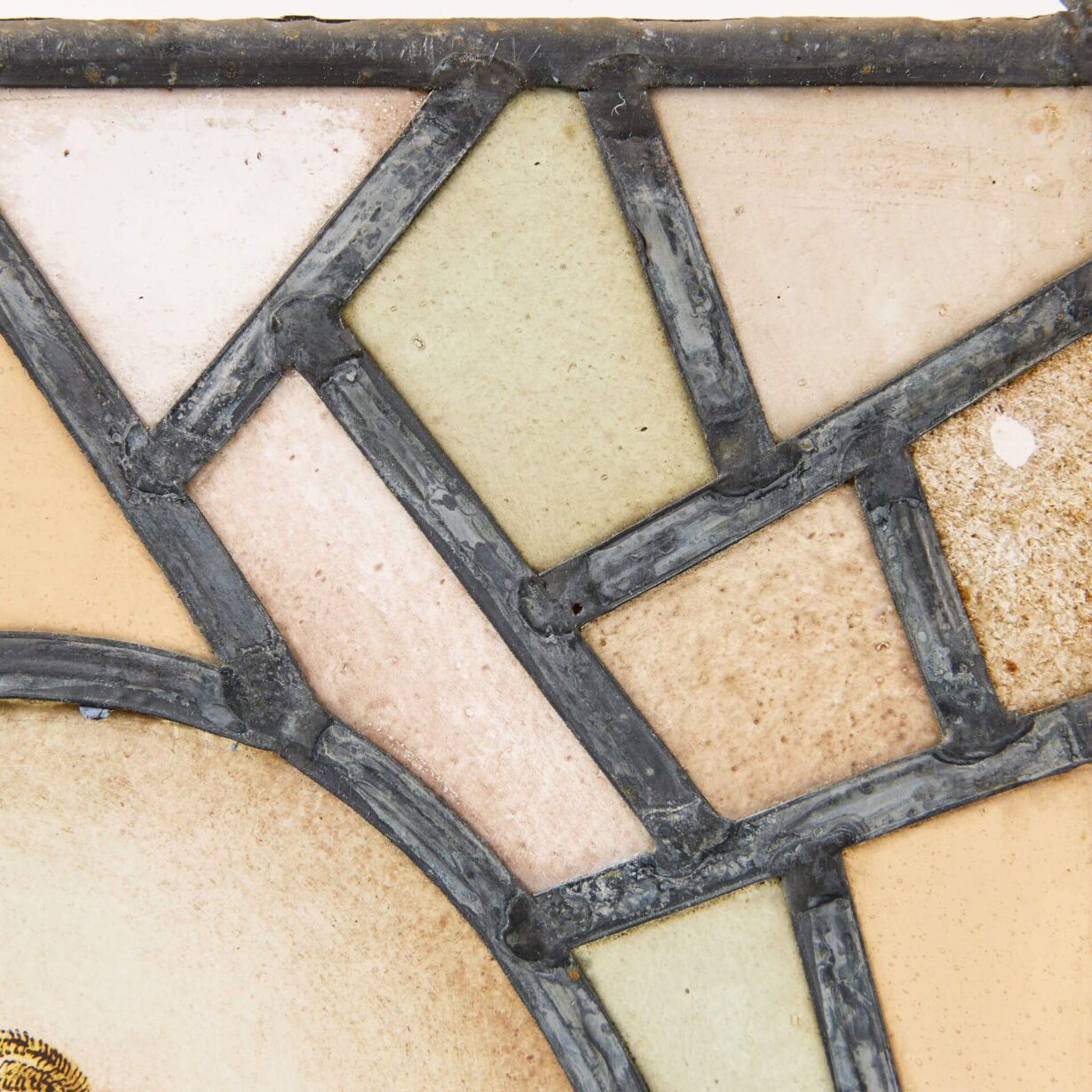 This small stained glass window is characterised by its muted colours and angular lines, providing somewhat of a contrast to the oval pane at the centre which captures the soldier, delicately hand-painted in 17th century attire with a musket over his shoulder.