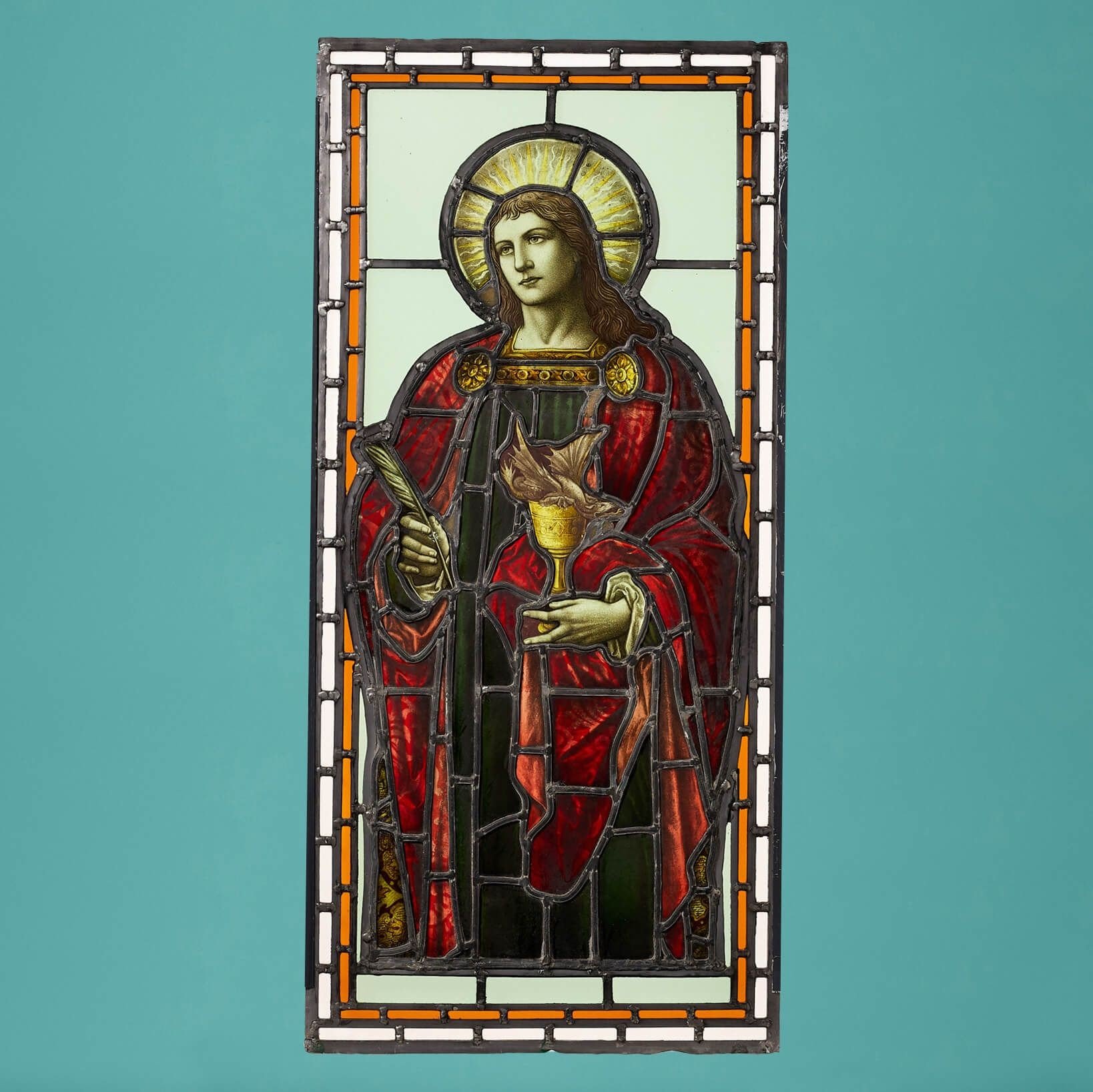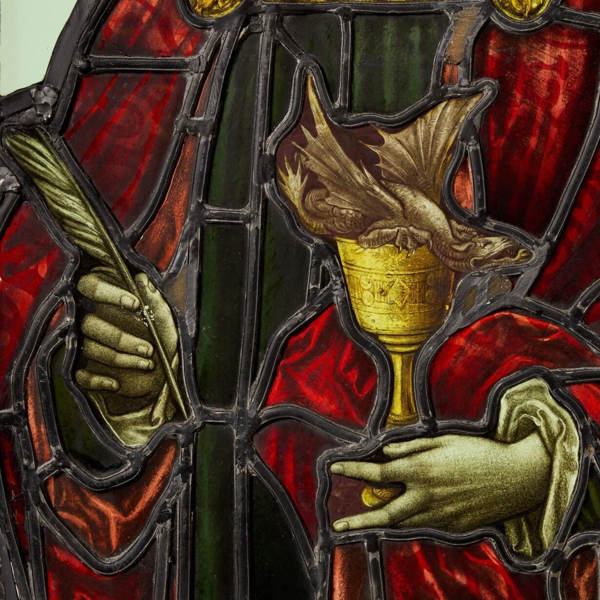 back to topA large and impressive antique stained glass window depicting St John, the Evangelist, dating from circa 1860. In this stunning glasswork piece, the Saint is depicted in vibrant red drapery, a feathered quill in one hand – representing his role as author of the Gospel of John – and a chalice in the other from which emerges a small dragon.