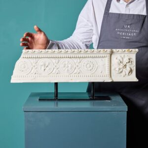 Once a fragment of a fireplace frieze panel, this piece is now mounted on a modern painted steel display stand.