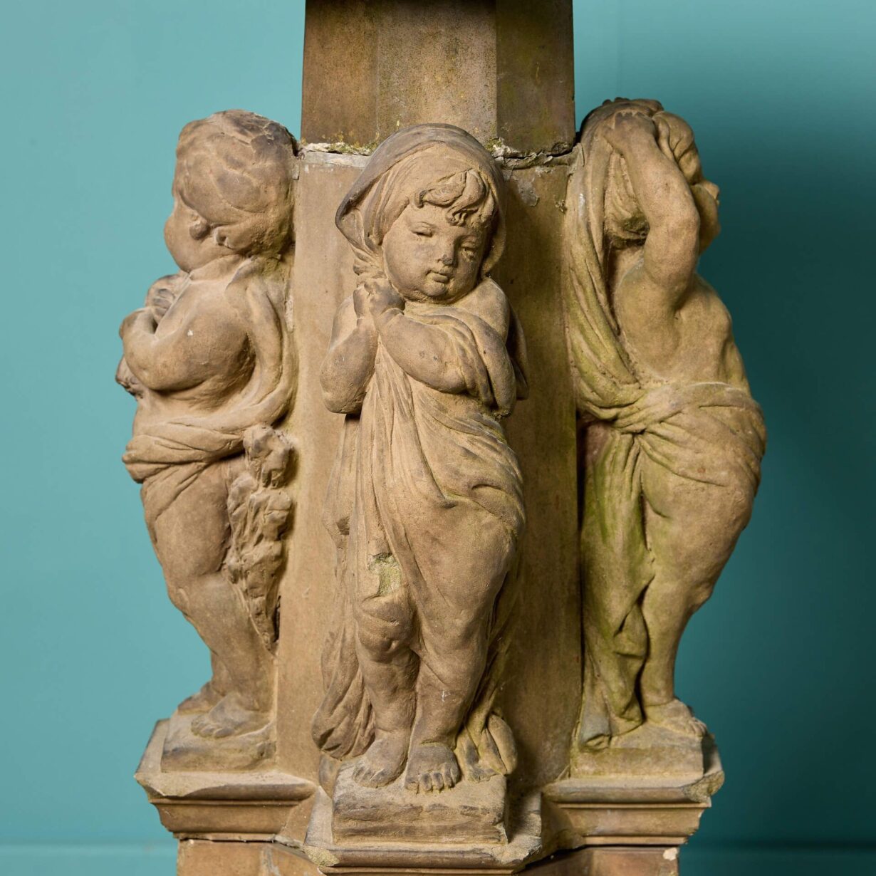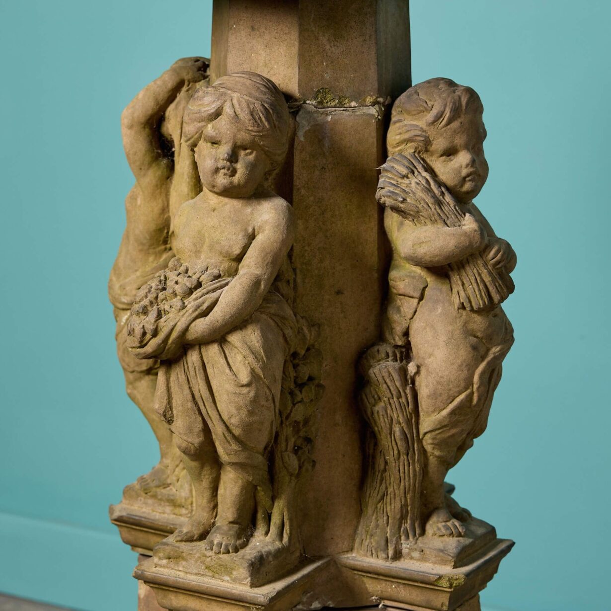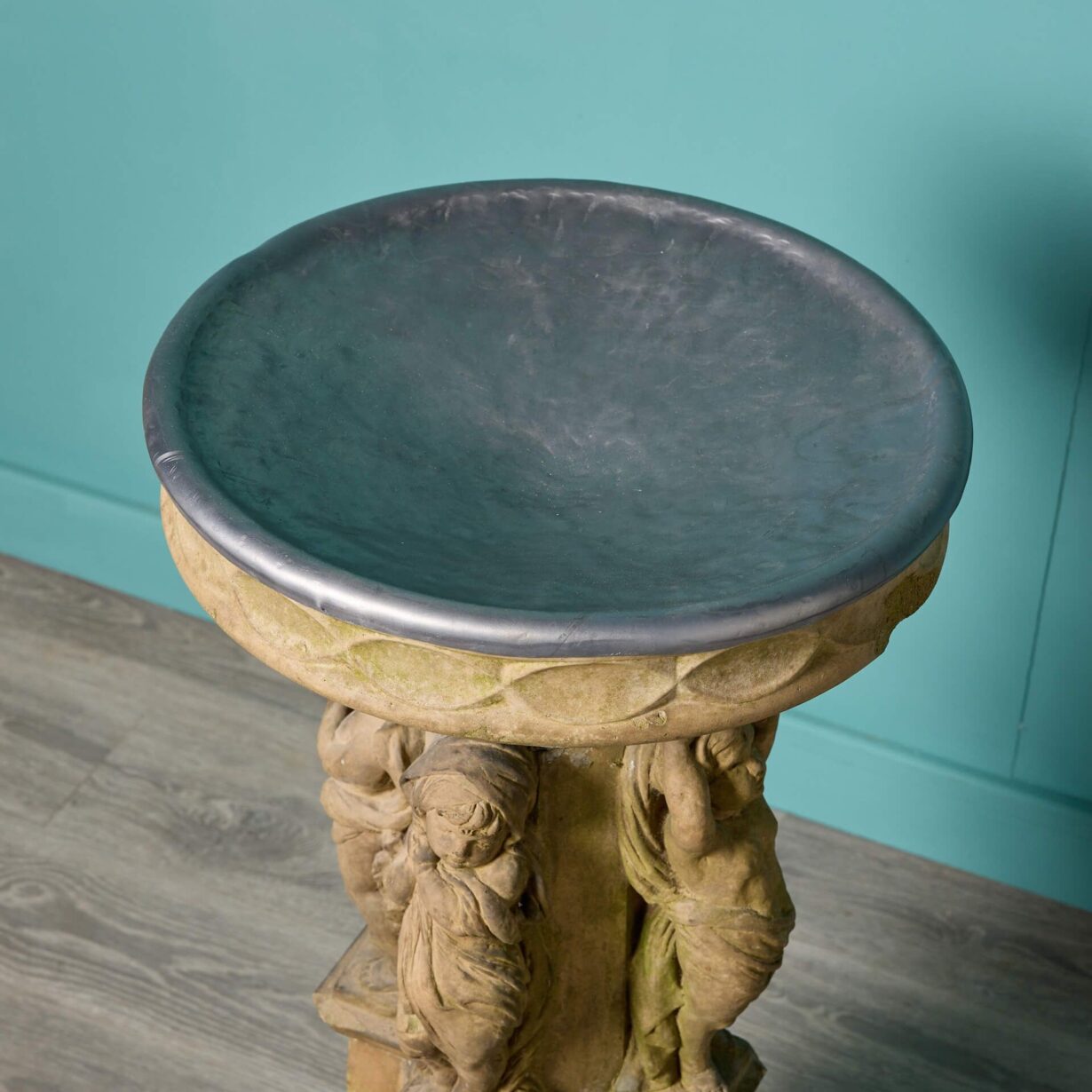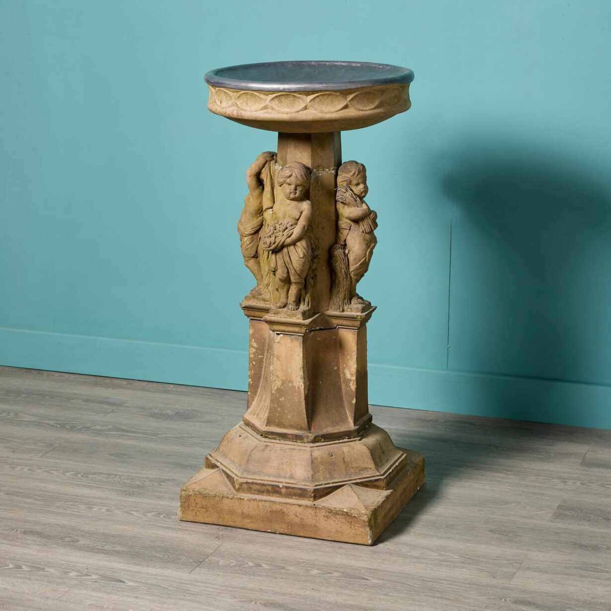 back to topAn antique stoneware birdbath displaying the four seasons. This wonderful birdbath is decorated with four figures depicting the original four season statues. Autumn, spring, winter, and summer are all represented through the action or clothing of each statue, as in Italian tradition.