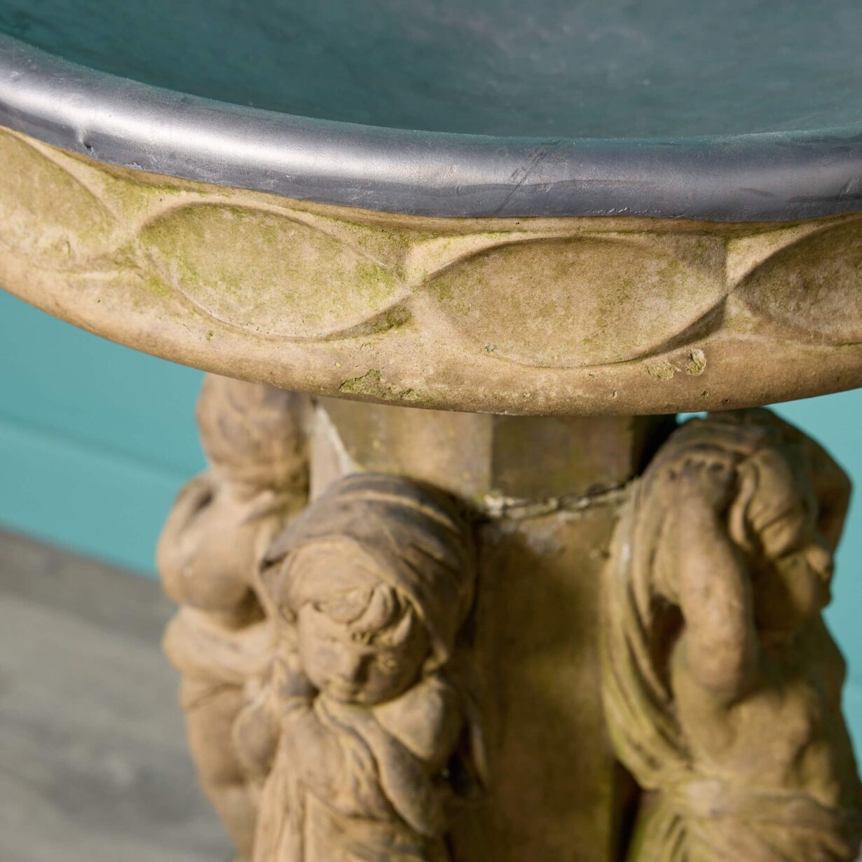This Victorian birdbath is a handsome design for a classically styled traditional garden or courtyard. The handcarved details of the four seasons and decorative design is enhanced by a desirable weathered finish. It features a thickly cast pedestal and a shallow lead lined dish, surrounded by a lattice pattern to the edge of the bowl.