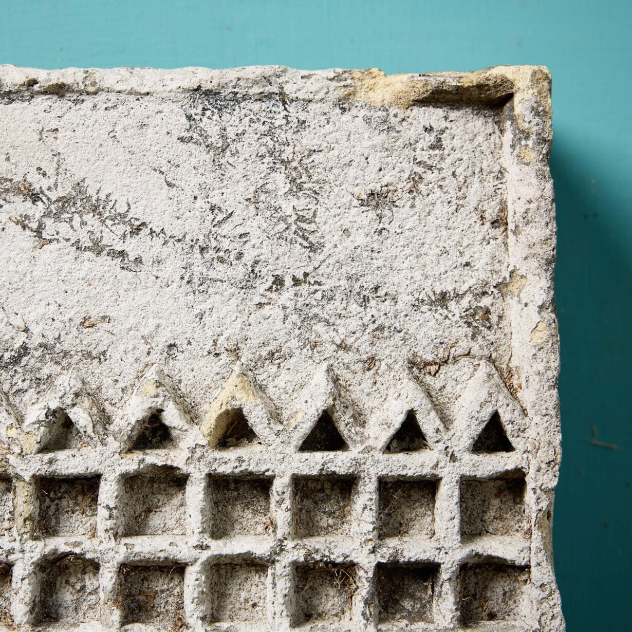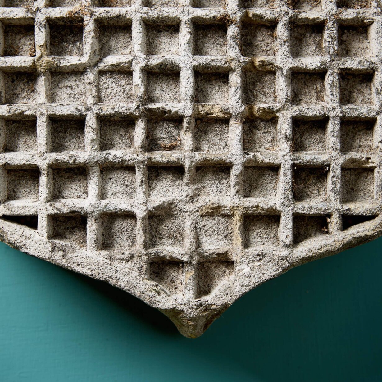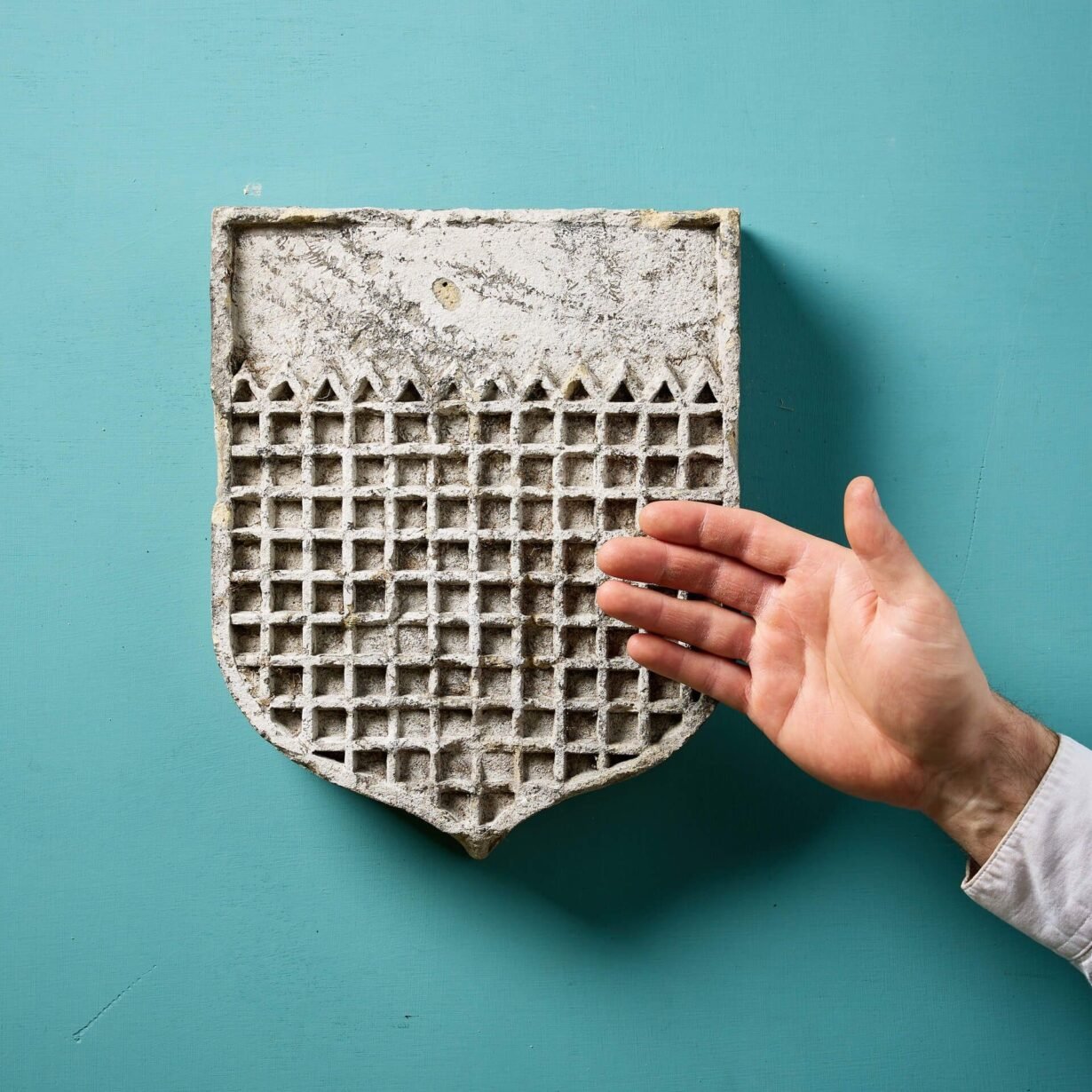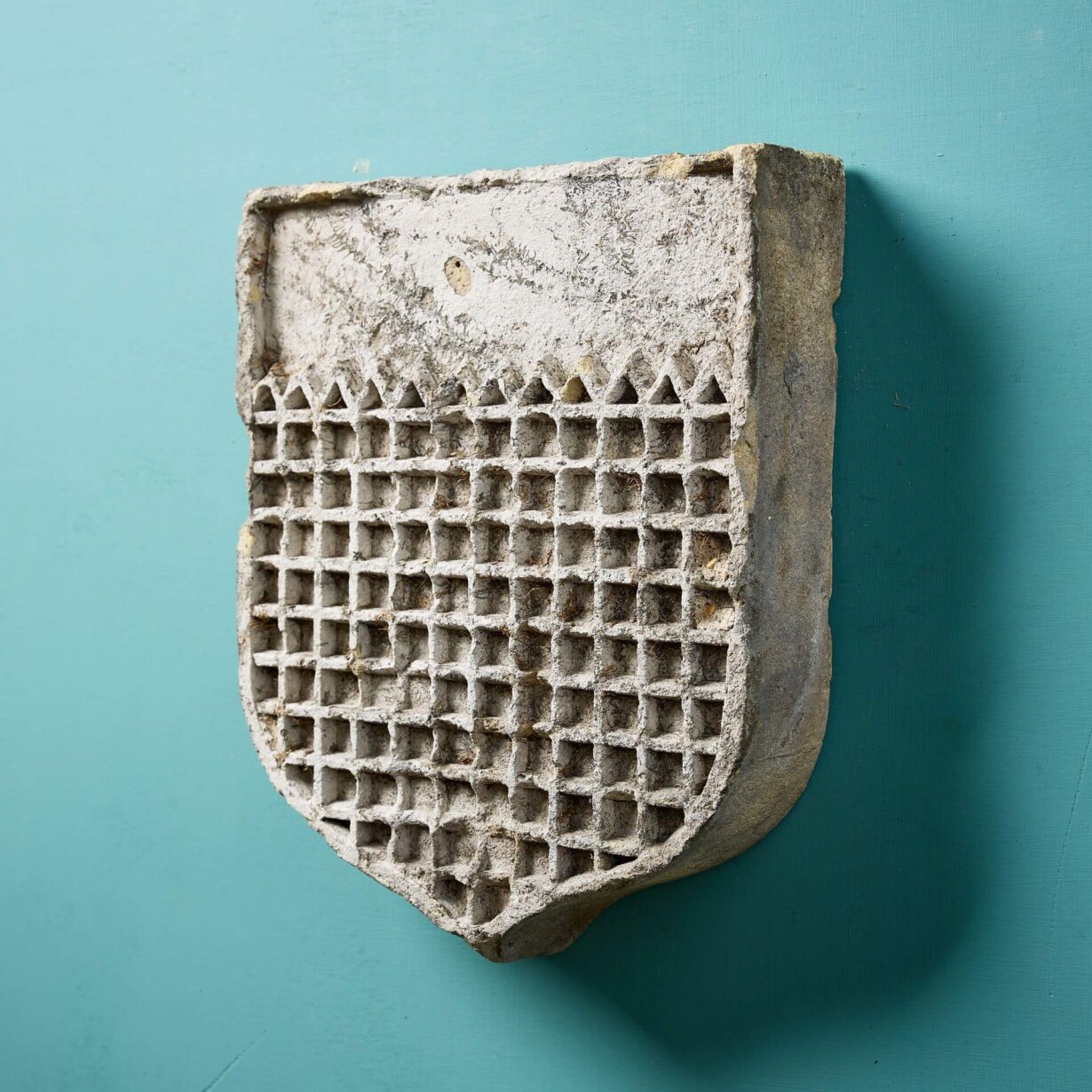 Beautifully weathered by the exposure to the elements over many years, this antique shield plaque is reminiscent of a castle portcullis with its chequered design – perhaps it was even originally styled with the point at the top, suggestive of an arched castle gate opening!