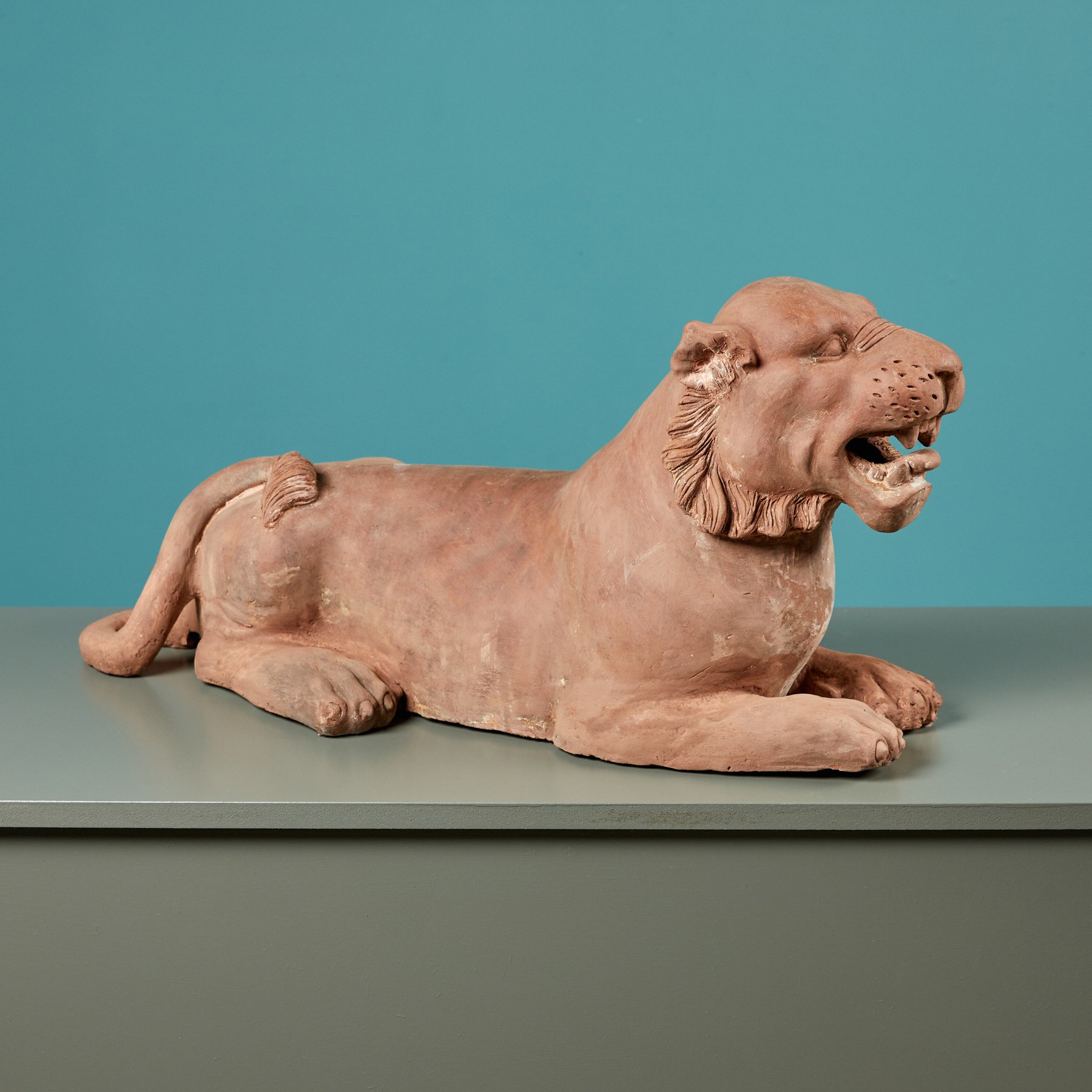 In antique architecture, lion and lioness statues were often paired together, flanking doorways and arches of importance and grandeur. For this reason, it is likely that this lioness once belonged alongside a lion of similar proportions, however they have since been parted or the lion lost. Nevertheless, this terracotta lioness is an impressive sculptural object with an expressive face and characteristic features.