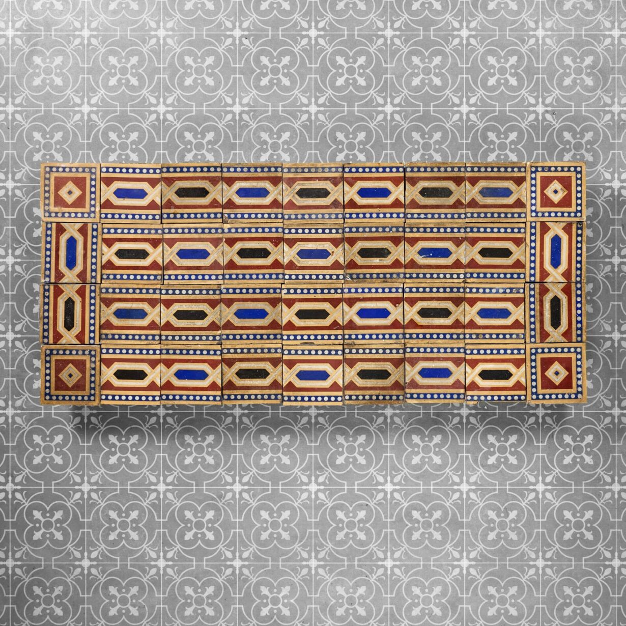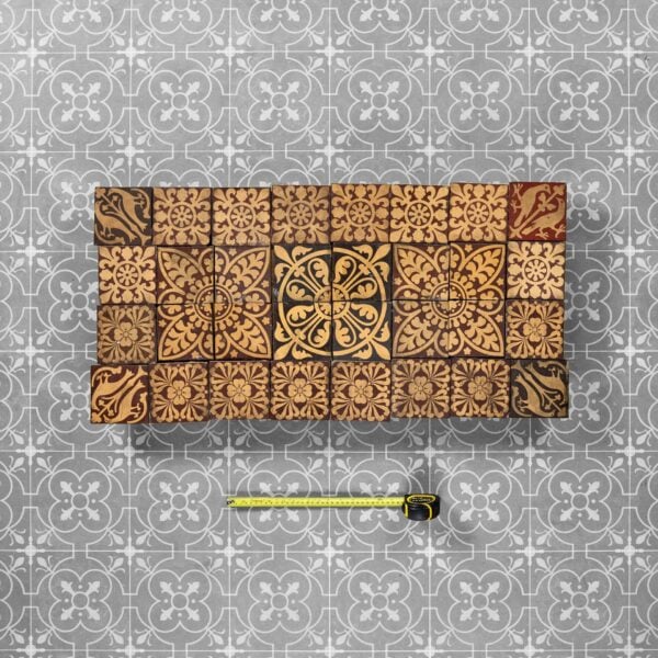 While we have arranged these antique tiles as pictured, they are not fixed and can be re-arranged in a desired pattern or shape to suit your interior project.
