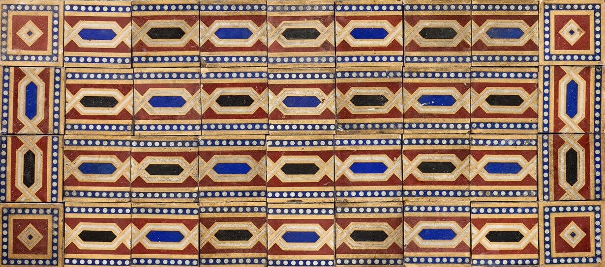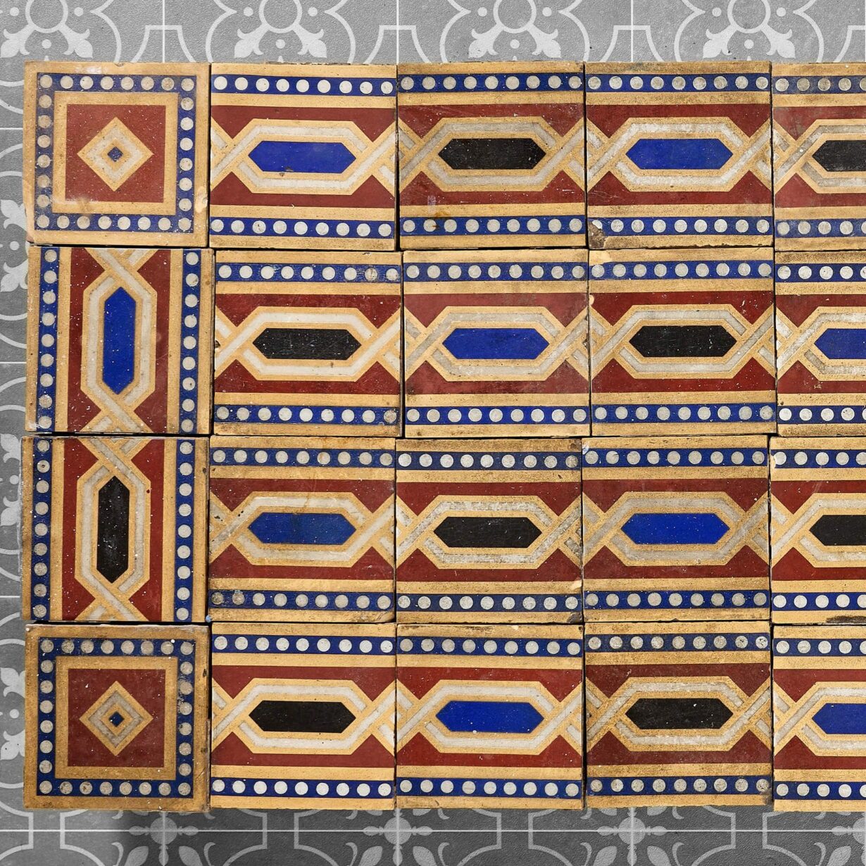 back to topA 36-piece set of 6-inch tiles by W. Godwin of Lugwardine in Herefordshire, perfect for use as an antique tile splashback, porch floor or fireplace hearth. Dating from the 19th century, these antique tiles together form an eye-catching geometric pattern consisting of black, blue and red colours that bring life and interest to even the smallest of spaces. These reclaimed tiles are over 150 years old. As such, each has a characterful, timeworn look with scuffs and marks here and there that only enhances the beauty of these striking patterned tiles.