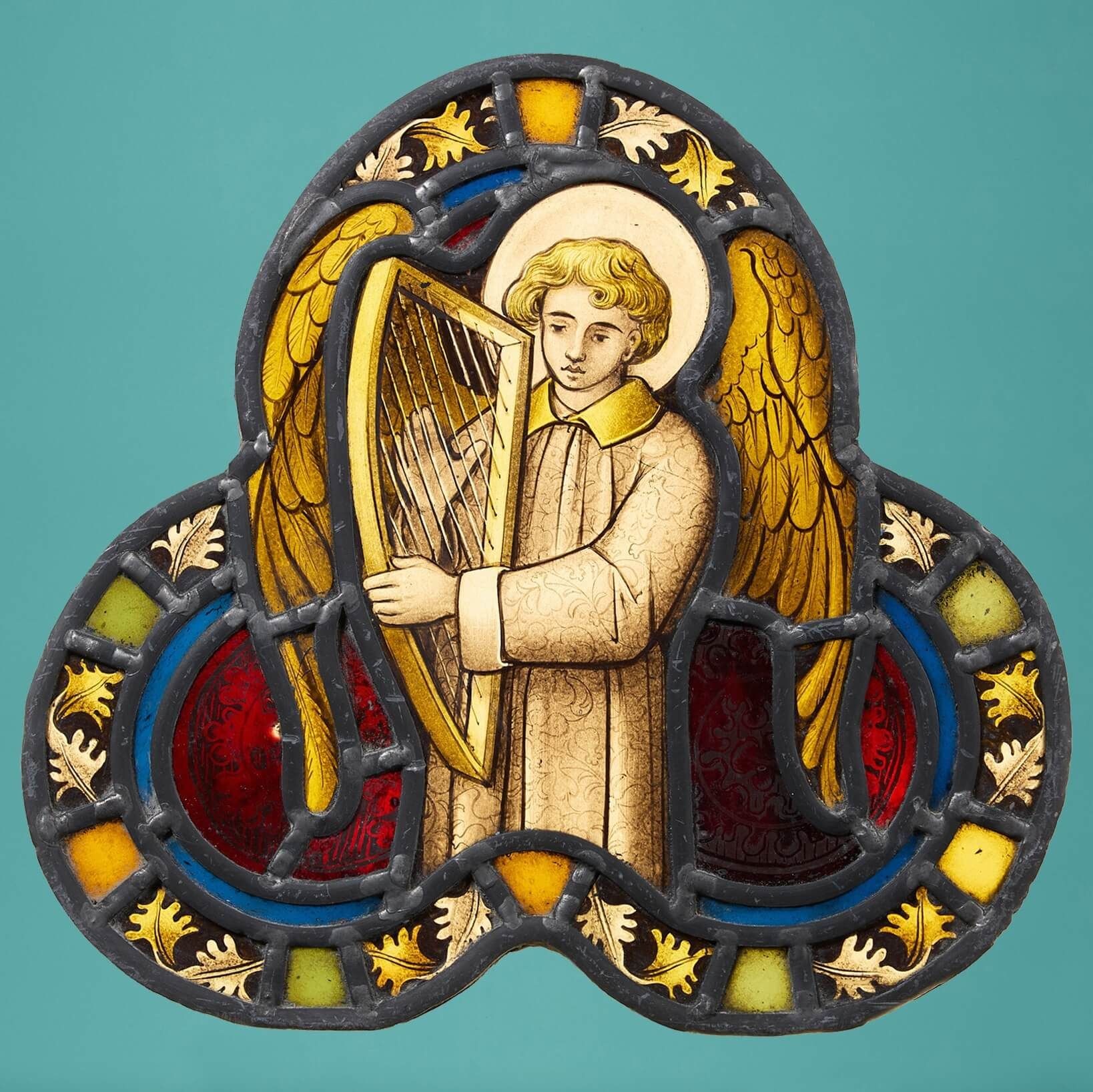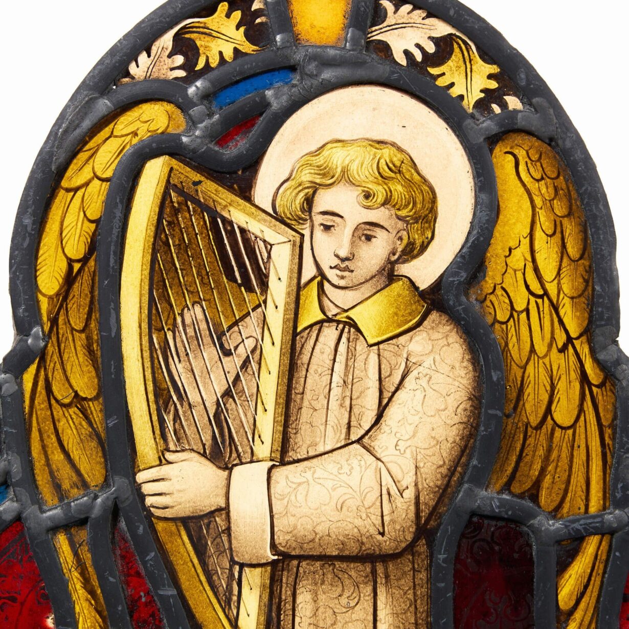 This stained glass window details an angel with curly blonde hair swathed in classical dress its golden wings outstretched, playing a harp, surrounded by a border of foliage with yellow and green hues.