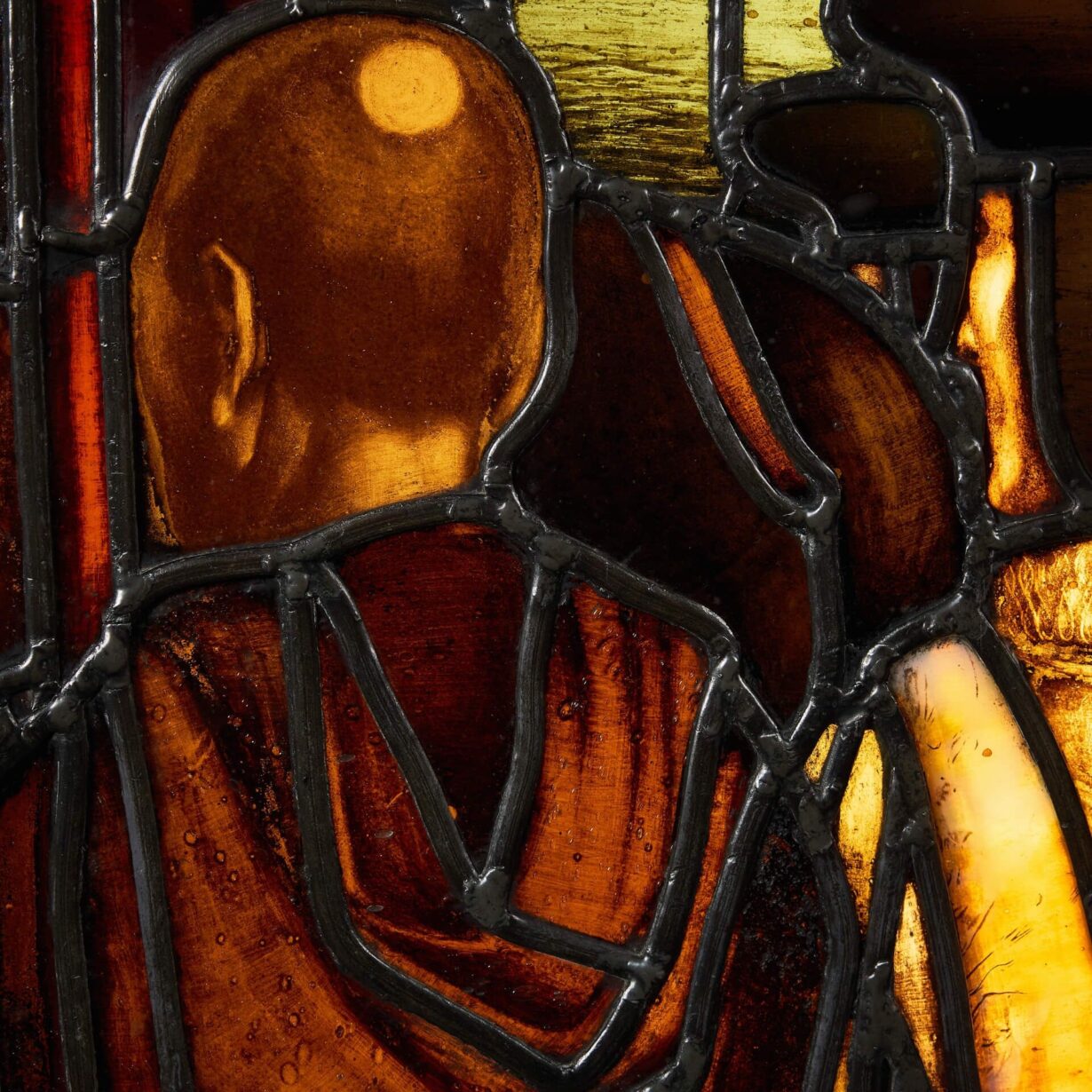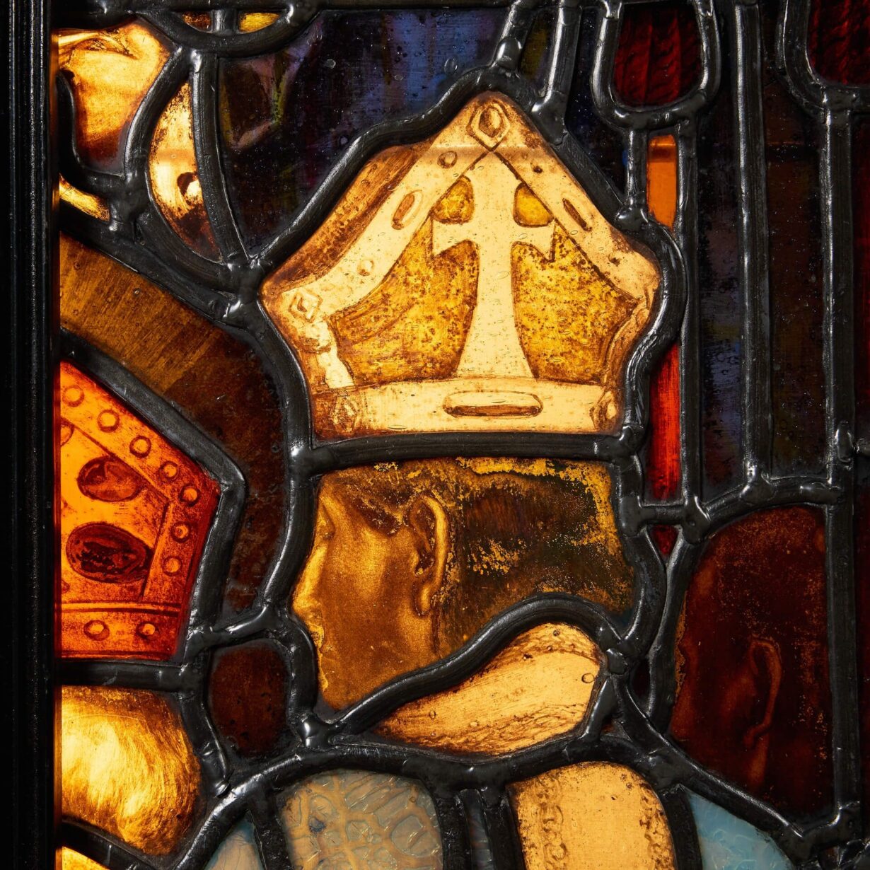 The stained glass is an impressive abstract Tudor style and the talented craftsmanship of its maker.