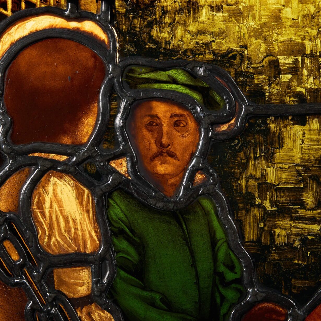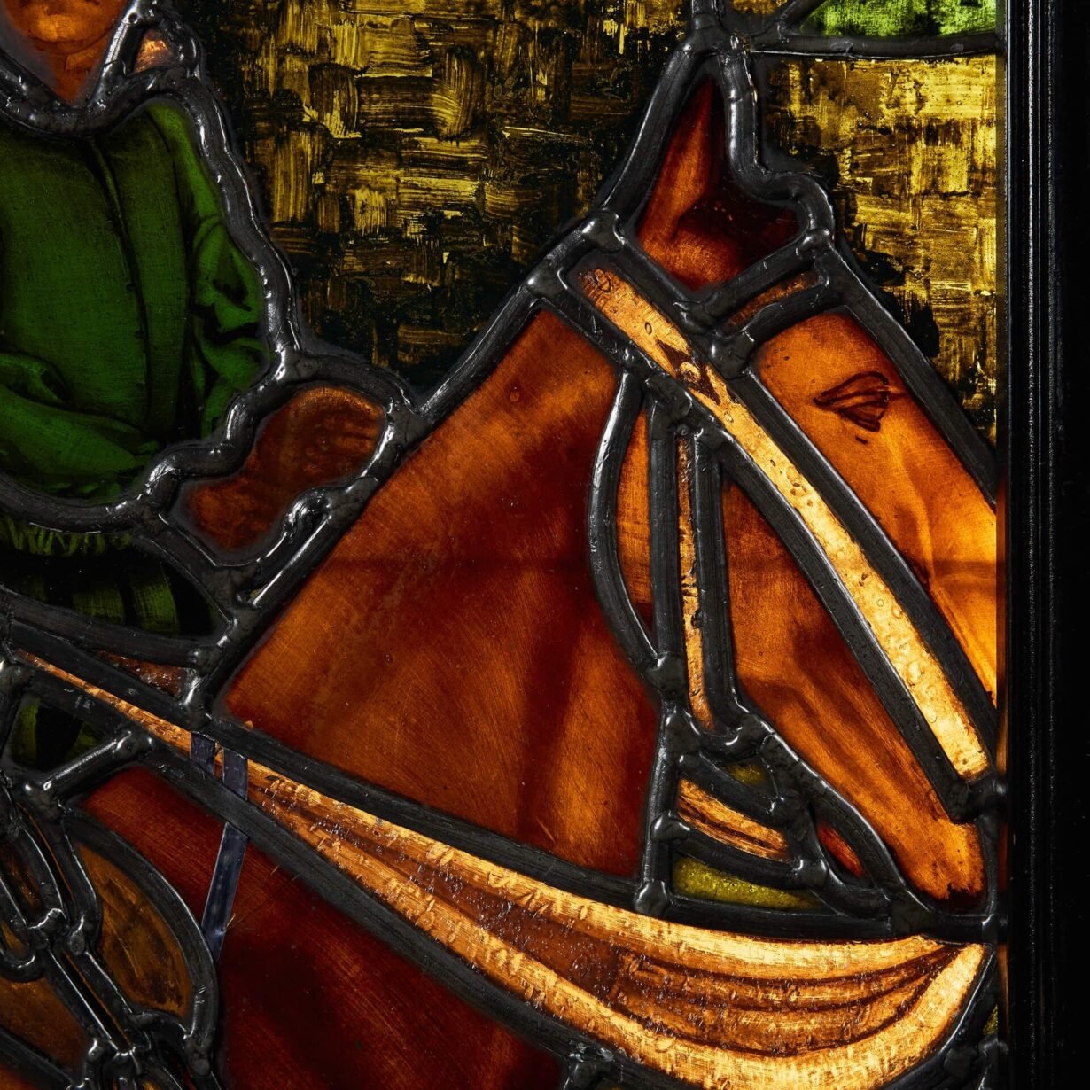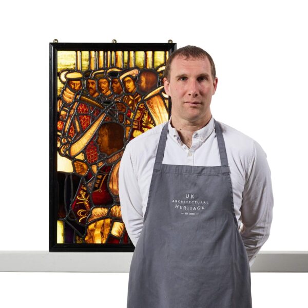 The scene depicts a pre-Raphaelite style and secular image, possibly depicting knights on horseback riding on a drawbridge – a scene from the Field of the Cloth of Gold where Henry VIII of England met Francis I of France, designed to improve relations between the two rival kingdoms.