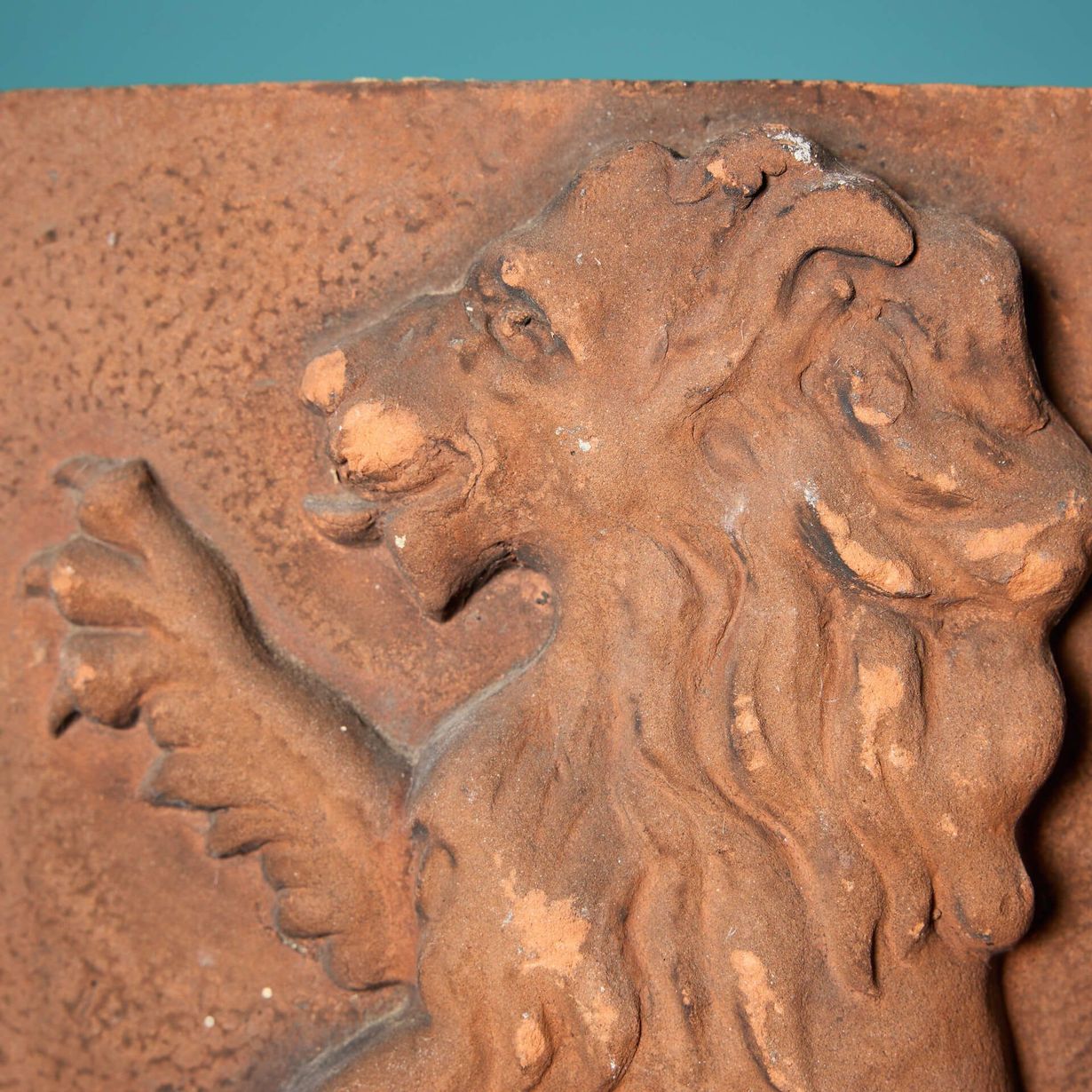 Lightly weathered, this large terracotta tile offers a glimpse into the styles and craftsmanship of history, the rampant lion a symbol of strength, royalty and courage in British heraldry.