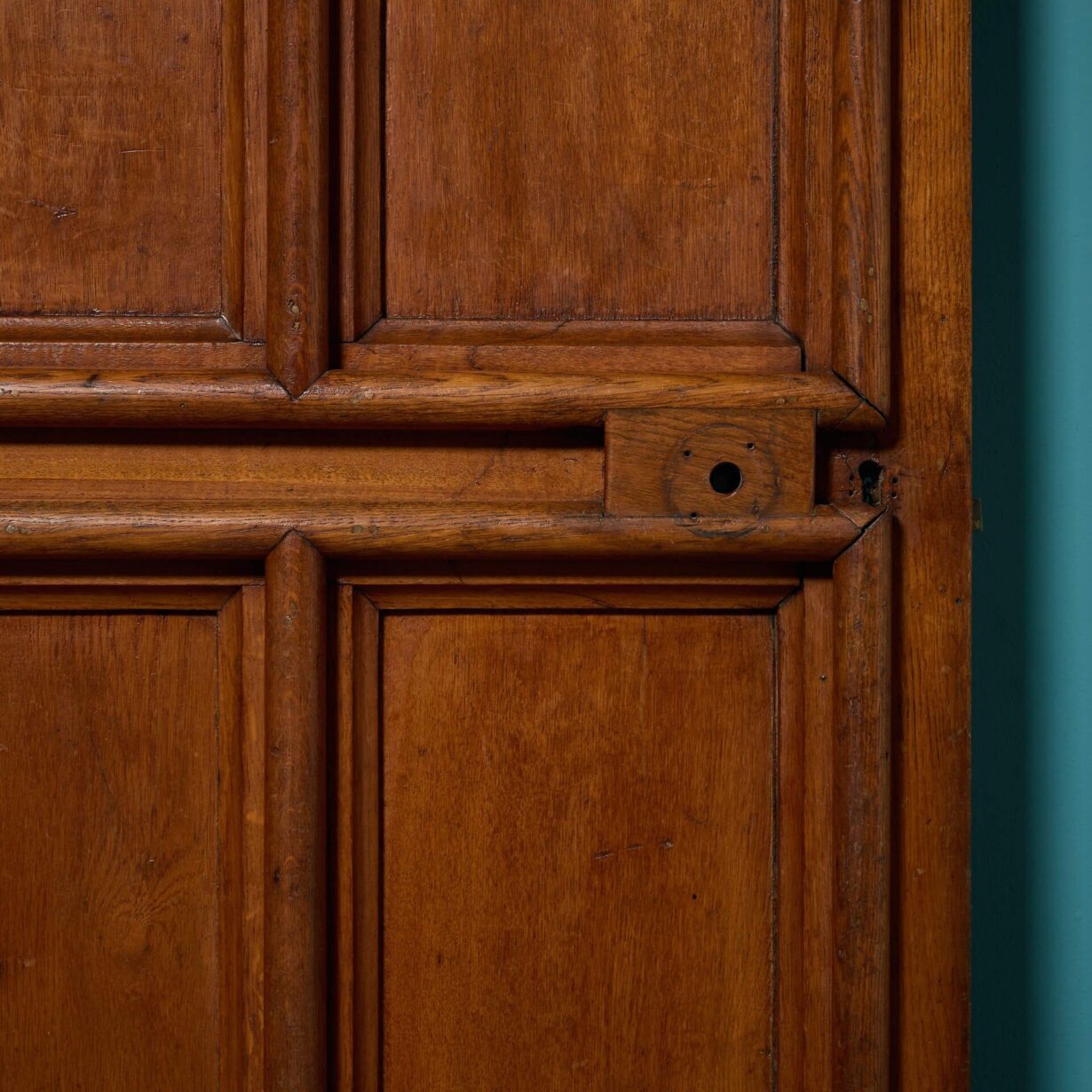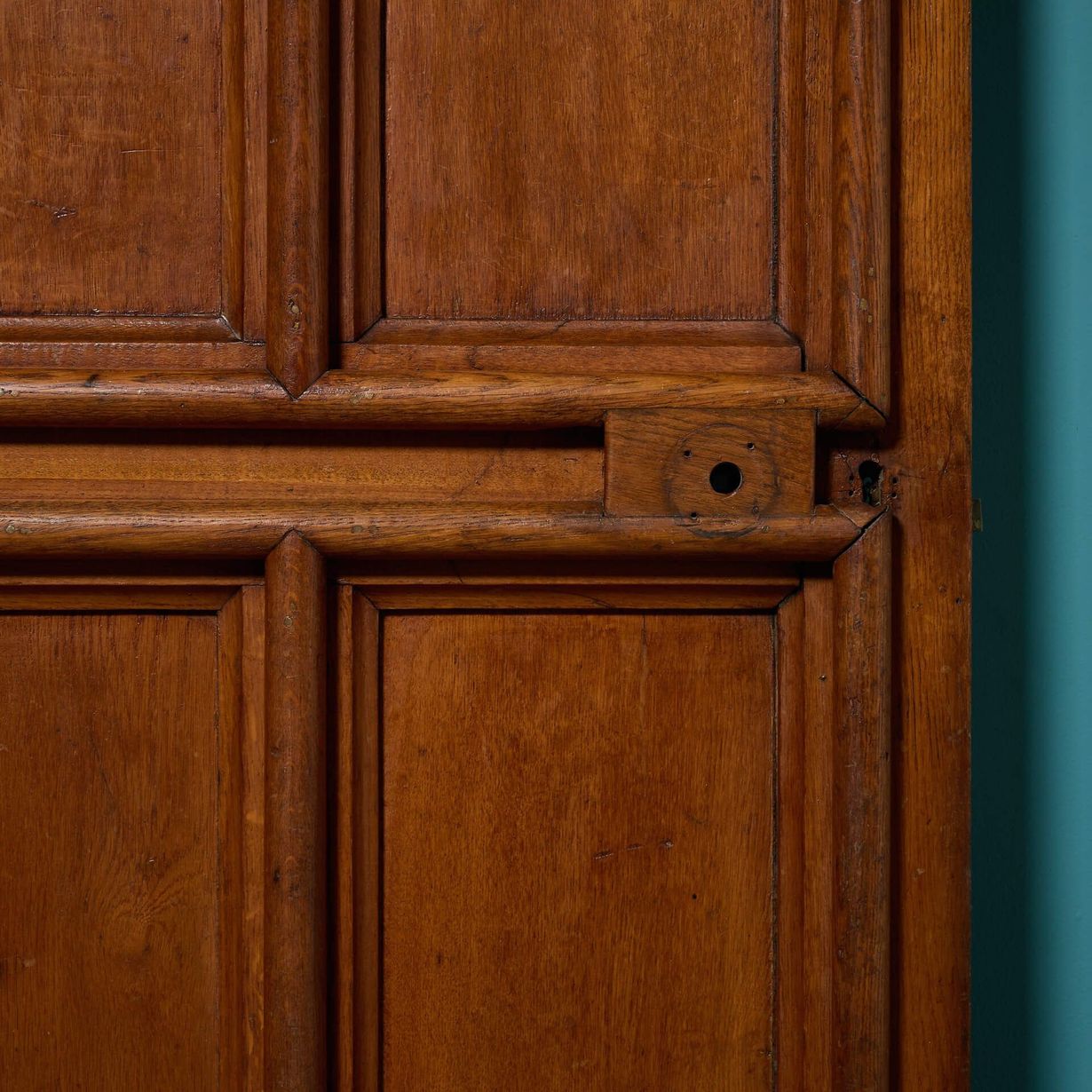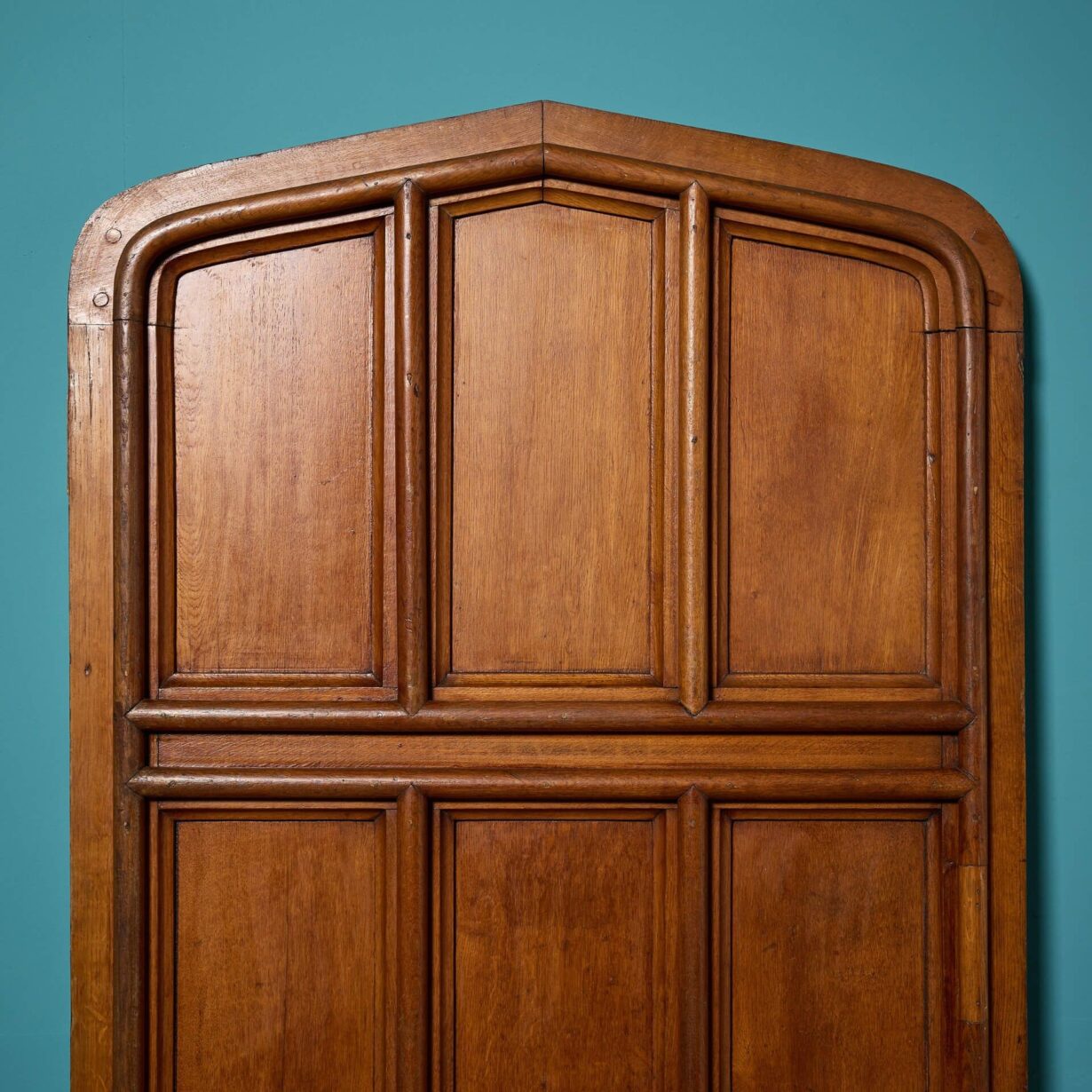 In Victorian and gothic styles, it is subtly arched with a mid-oak finish. It sectioned with rounded raised moulding with large proportions and original brass hinges. The internal face is sanded to reveal a lighter oak finish.