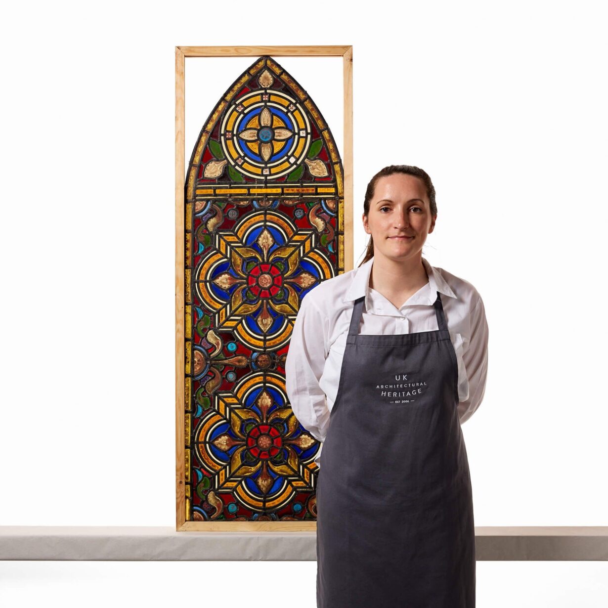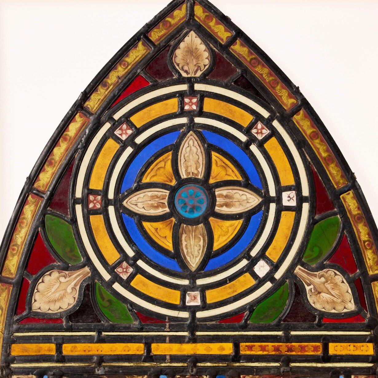 back to topAn antique Victorian arched stained glass window showcasing a stylised Tudor rose, originally from a church in northern England.