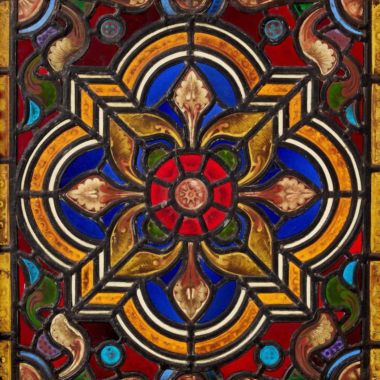 Three hand painted detailed flowers, thought to be the Tudor Rose, sit at the heart of this Victorian era stained glass piece. It incorporates both ecclesiastical and medieval styles, accompanied by vibrant and vivid colours of red, blue, green, and yellow.
