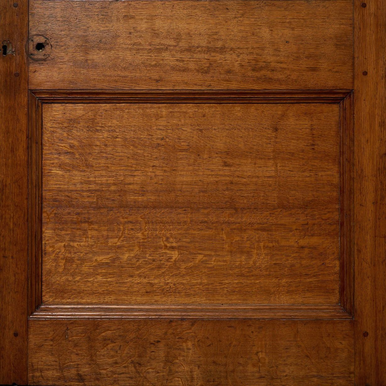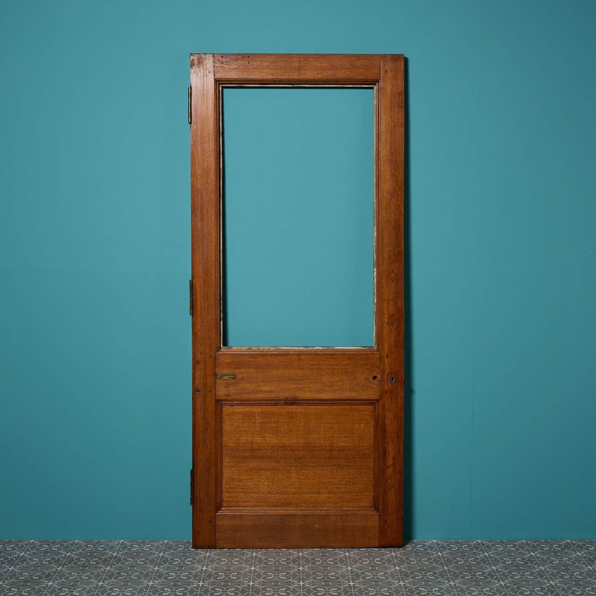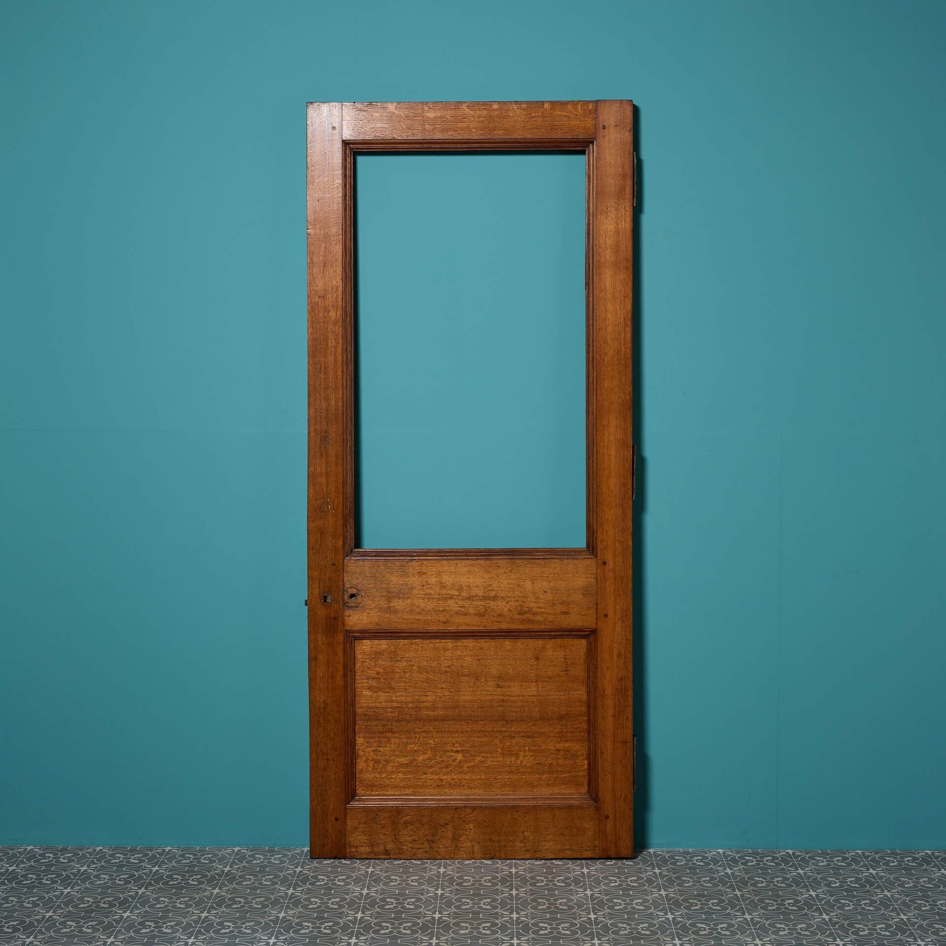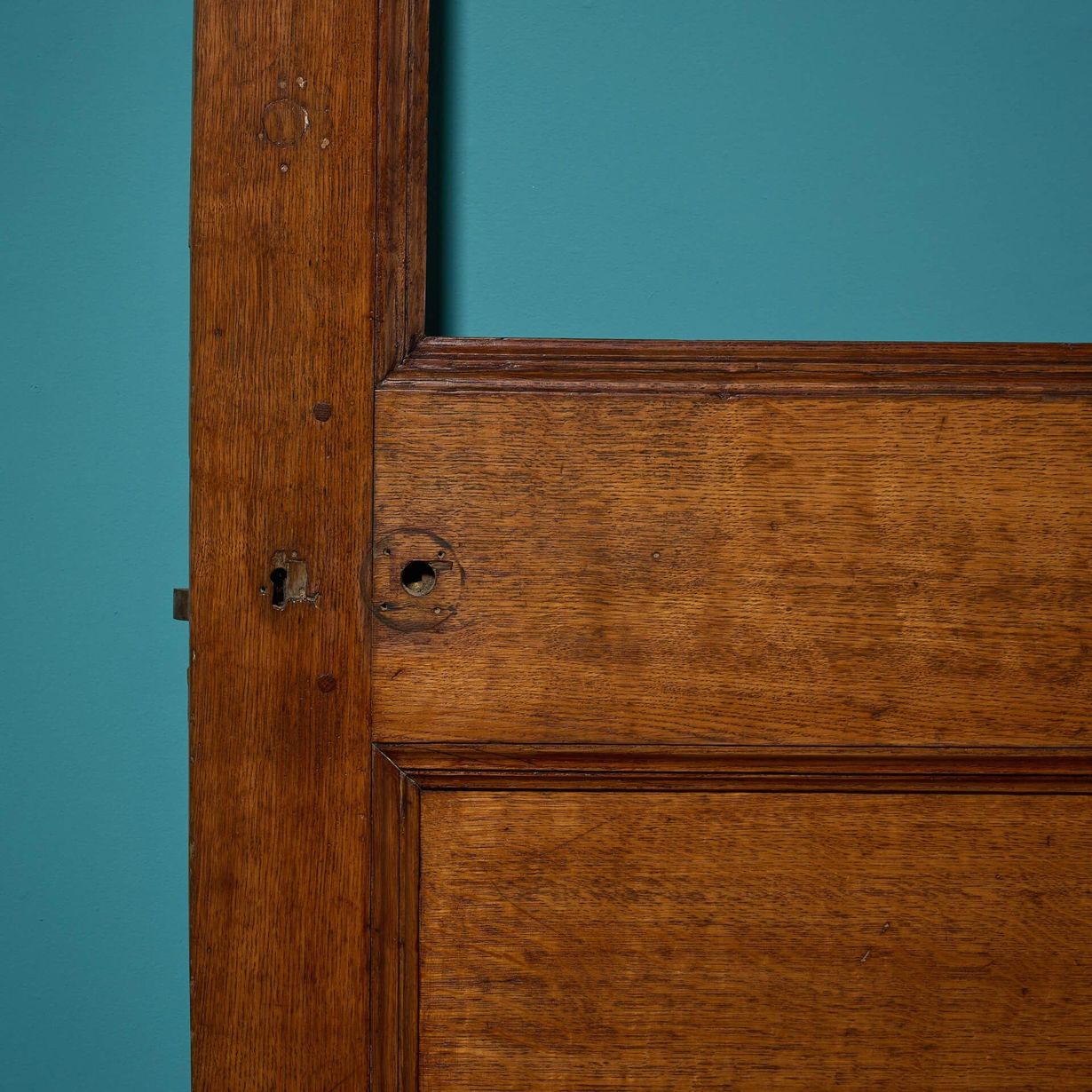 This interior or exterior mid-oak door dates to circa 1900, and includes original brass hinges. It is unglazed.