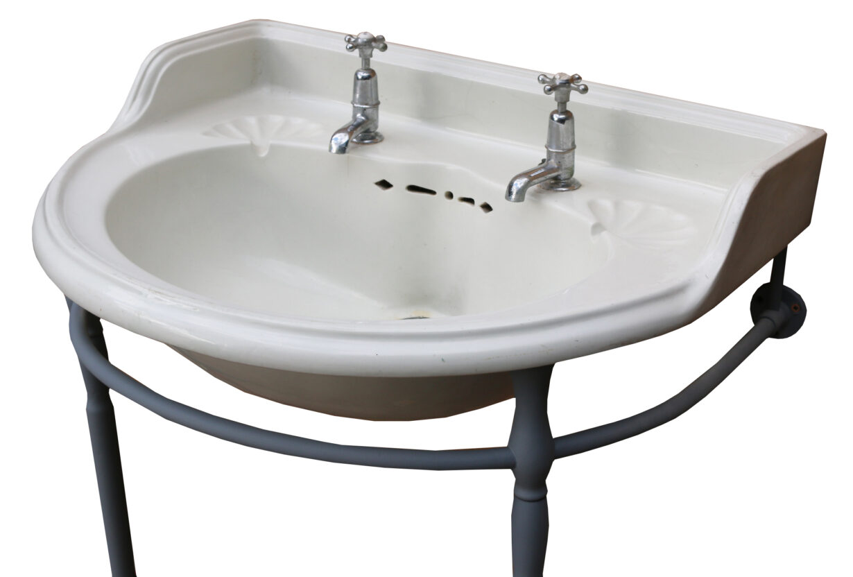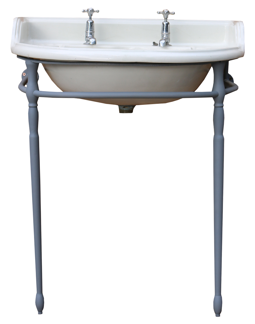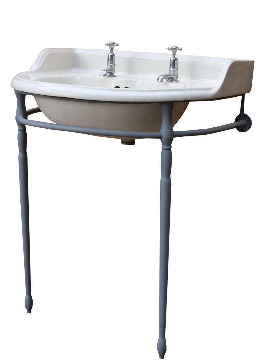 back to topAntique Victorian Sink with Stand. A porcelain basin with cast iron and timber floor standing bracket. The taps are included. The bracket has been finished in a grey primer.