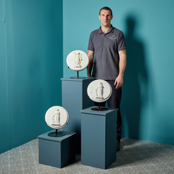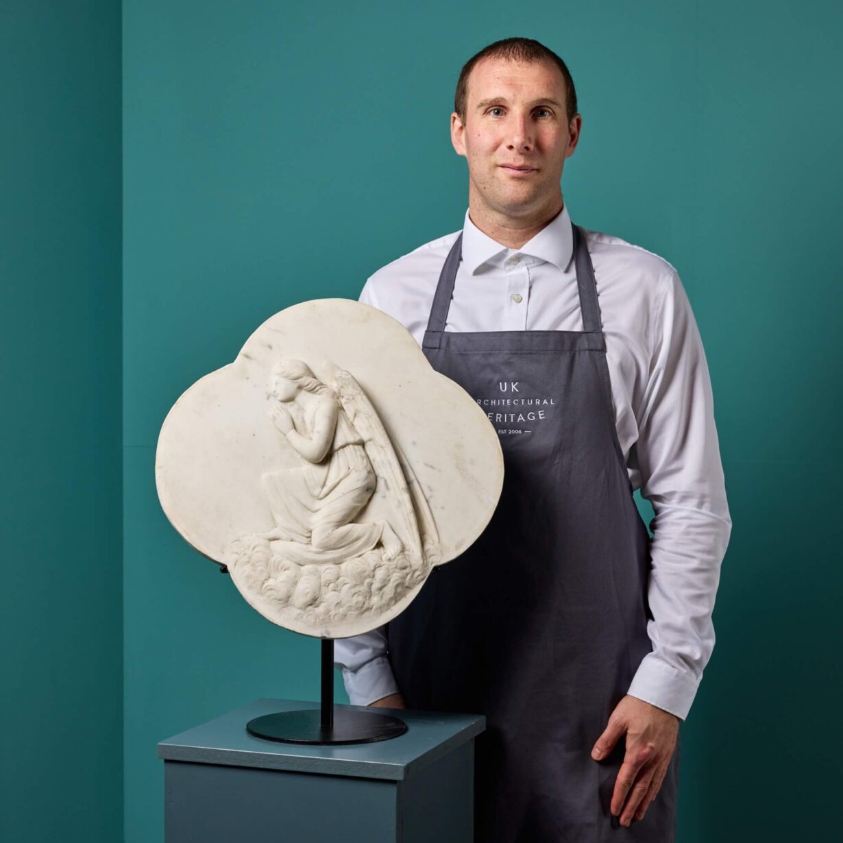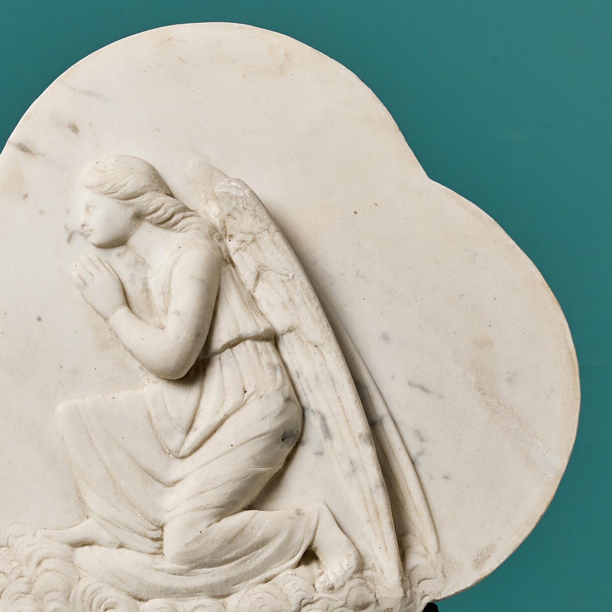 back to topThis elegant quatrefoil shaped white marble plaque depicts a kneeling angel in high relief mounted on a bespoke steel stand. Intricately carved, the angel is left facing, kneeling on a flourish of clouds with hands in a prayer position, suggesting it was once used as an altar piece or embellishment in a church or religious building. It dates from the 1870s and has been beautifully preserved with only light weathering, surface marks and discolouration in places to the white Carrara marble. It makes a stunning decorative object for an interior, ideal for a converted chapel or a classically styled Victorian property.