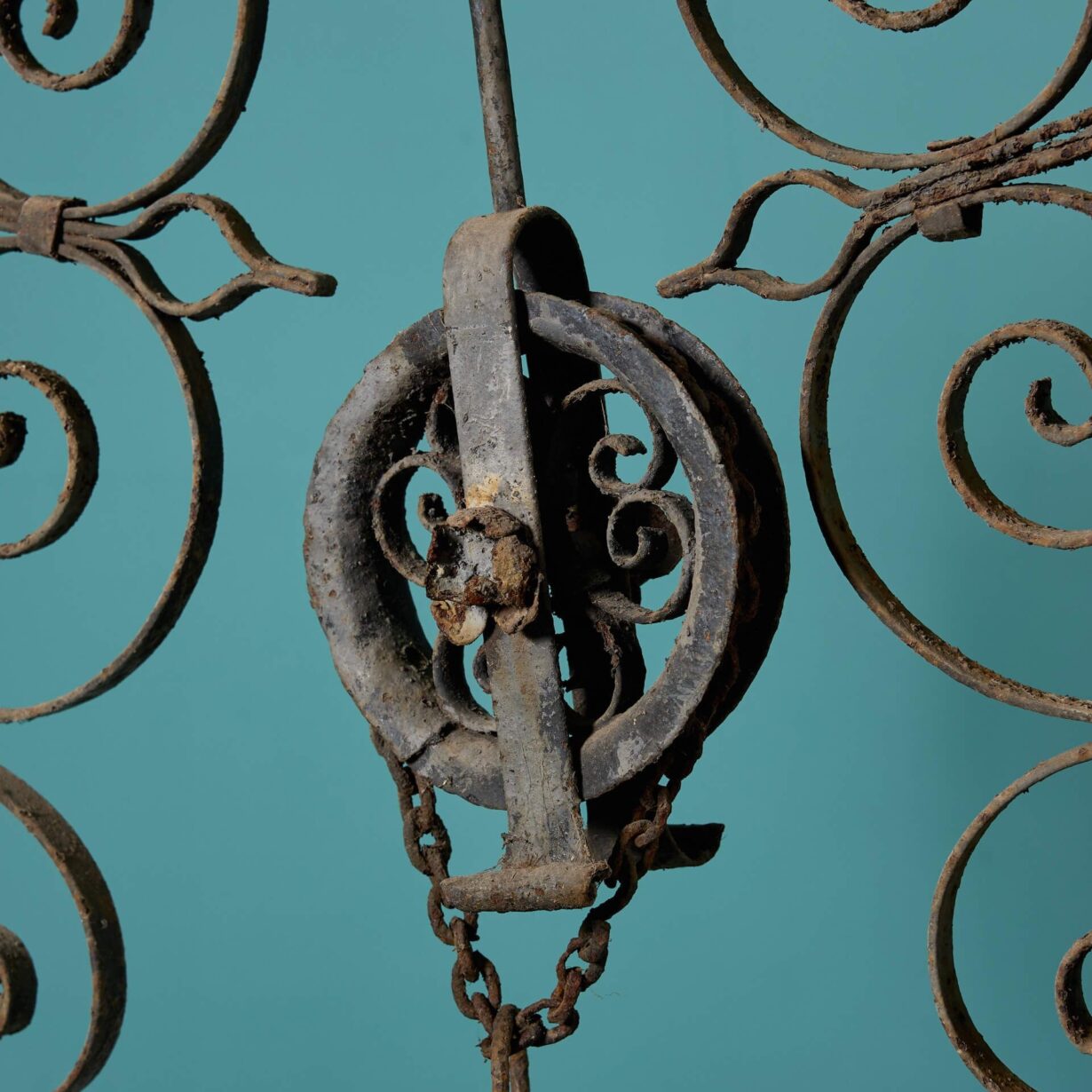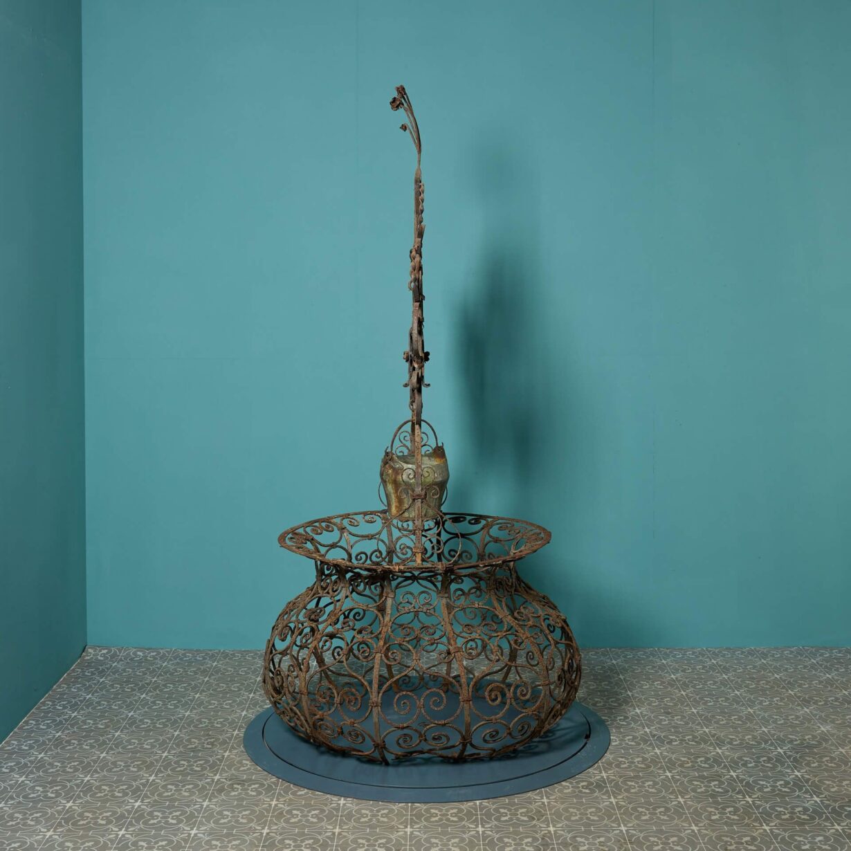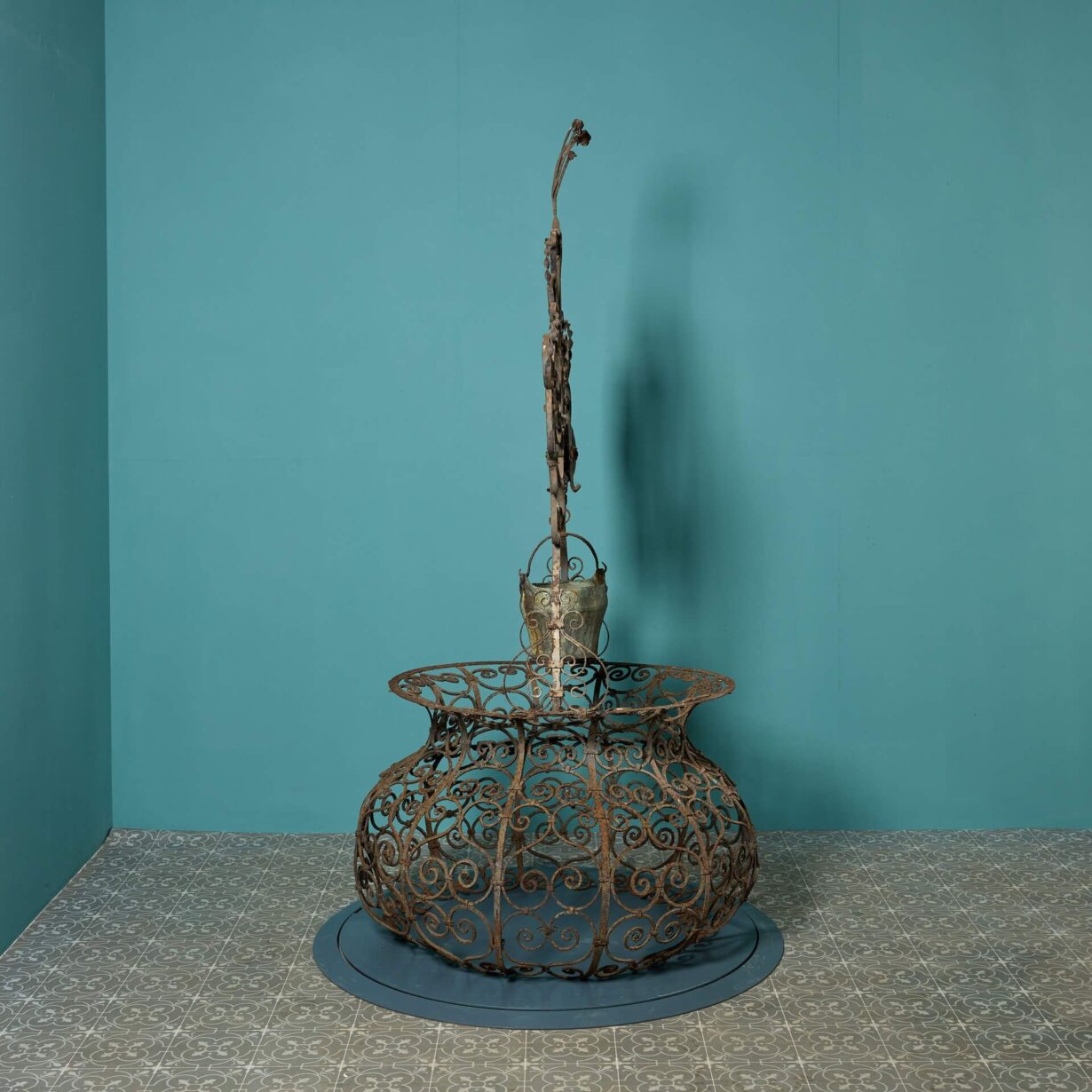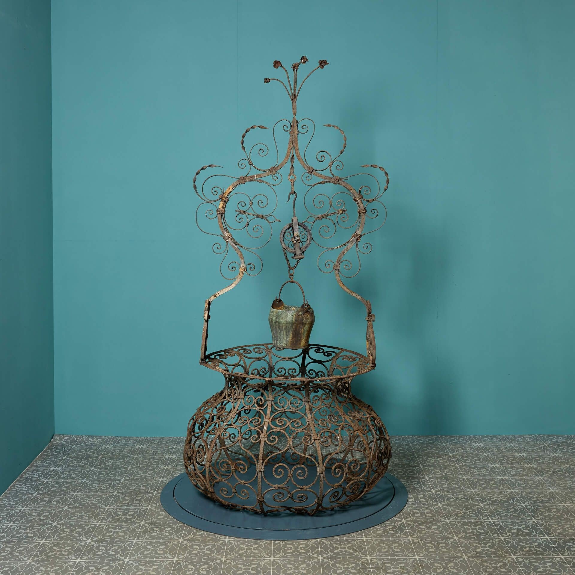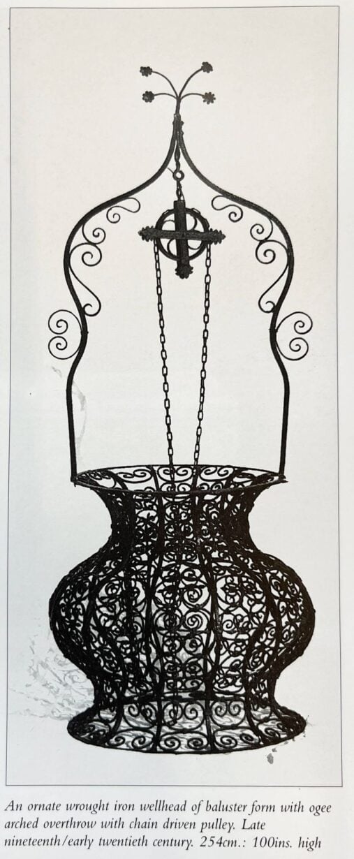 back to topAn ornate antique wrought iron wellhead of baluster form with ogee arched overthrow and chain driven pulley holding a copper bucket.