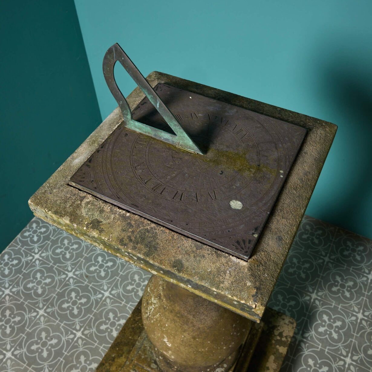 back to topAn English carved York limestone sundial of baluster shape, fitted with its original slate sundial plate and bronze gnomon. Various fine inscriptions are etched into the slate plate, but it is difficult to decipher.