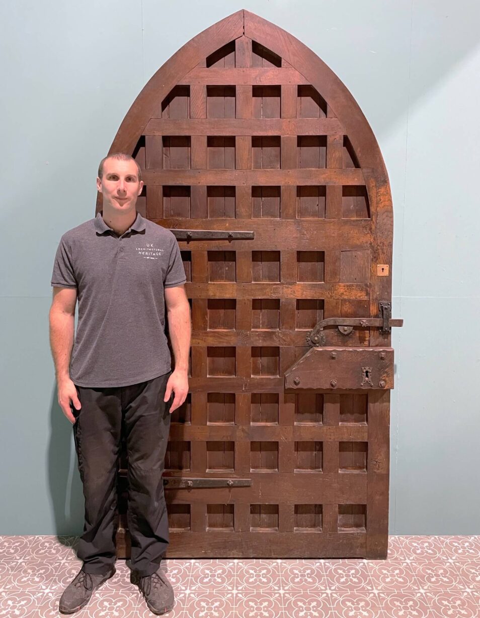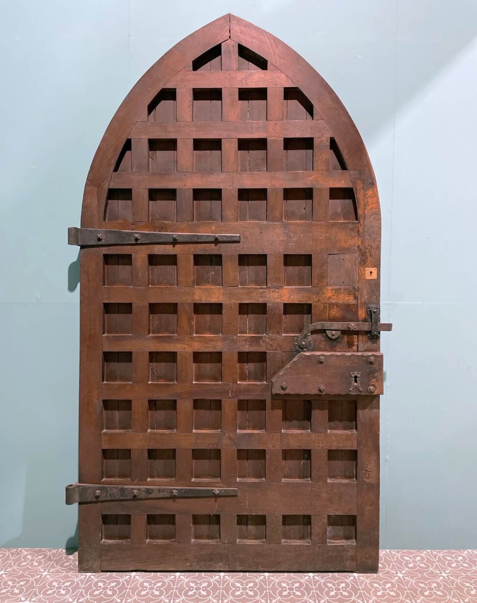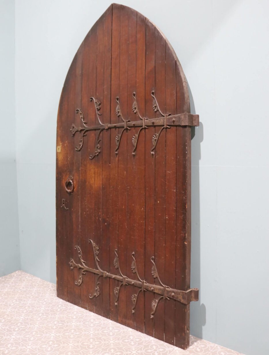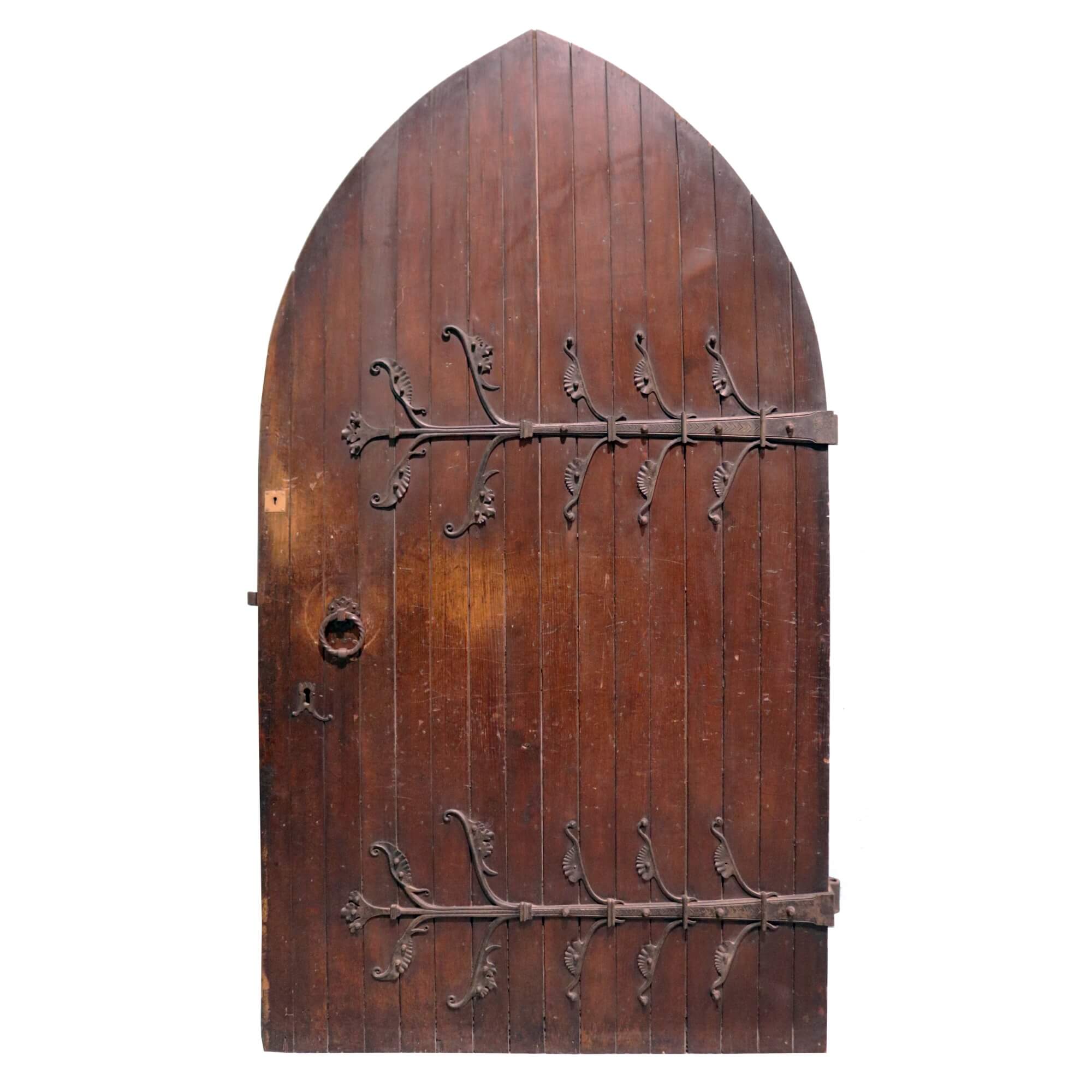 back to topSourced from a cathedral in the south west of England, this arched gothic front door dates from the mid 1800s. On the front, it features vertical oak plank batten construction detailed with original strap hinges. These are highly decorative, showcasing scrolls stylised with foliage in a style often associated with the gothic era. At the time of the door’s construction, a blacksmith would have made these hinges by hand, heating the wrought iron to extreme temperatures and hammering the design into the shape and sturdy structure required to support the heavyweight oak. At the back, this gothic oak door is just as unusual, made from a reinforced construction of vertical and horizontal panels. It features the a large lock and the original latch.