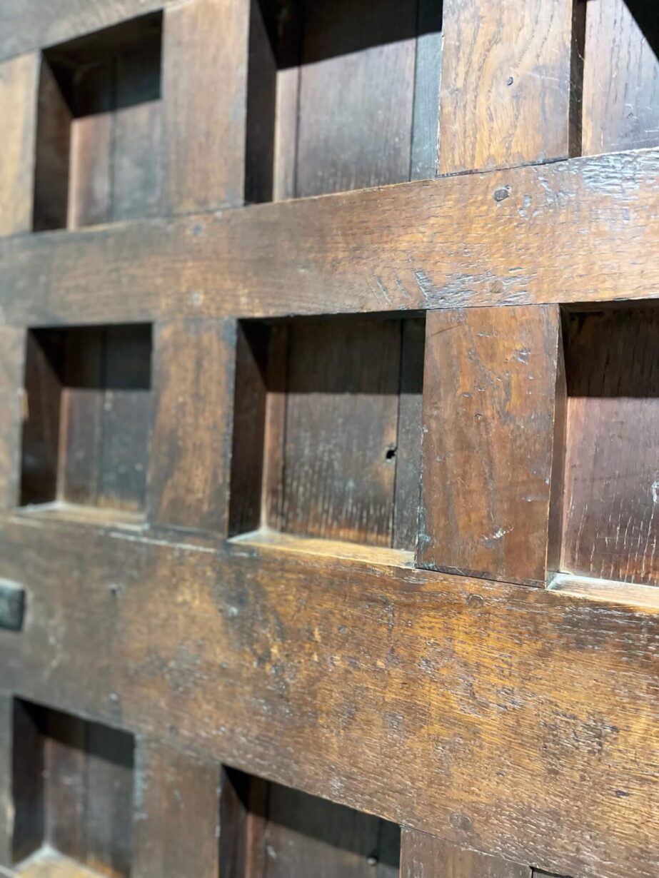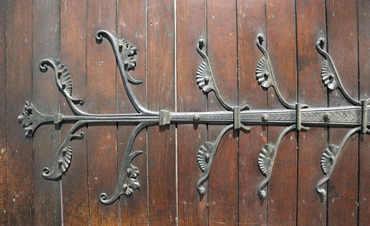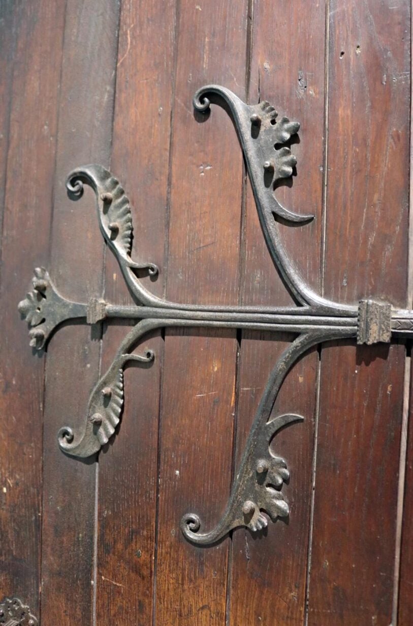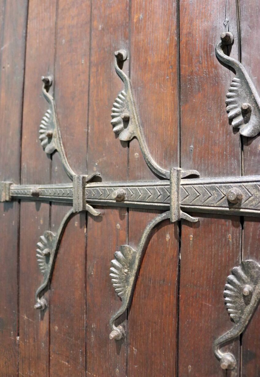 back to topSourced from a cathedral in the south west of England, this arched gothic front door dates from the mid 1800s. On the front, it features vertical oak plank batten construction detailed with original strap hinges. These are highly decorative, showcasing scrolls stylised with foliage in a style often associated with the gothic era. At the time of the door’s construction, a blacksmith would have made these hinges by hand, heating the wrought iron to extreme temperatures and hammering the design into the shape and sturdy structure required to support the heavyweight oak. At the back, this gothic oak door is just as unusual, made from a reinforced construction of vertical and horizontal panels. It features the a large lock and the original latch.