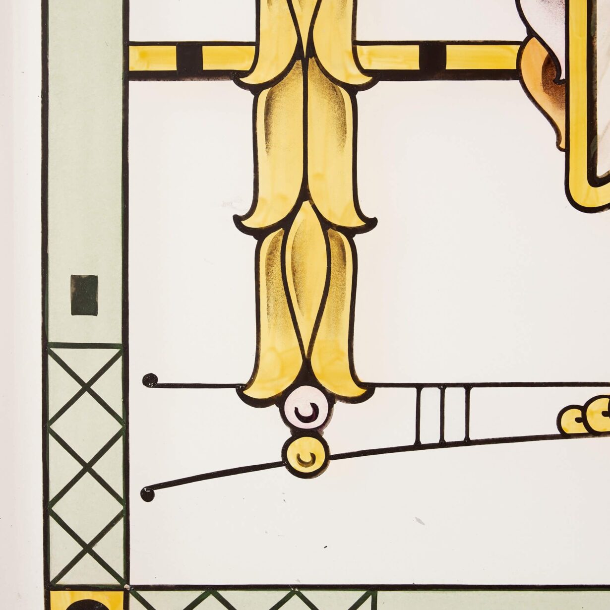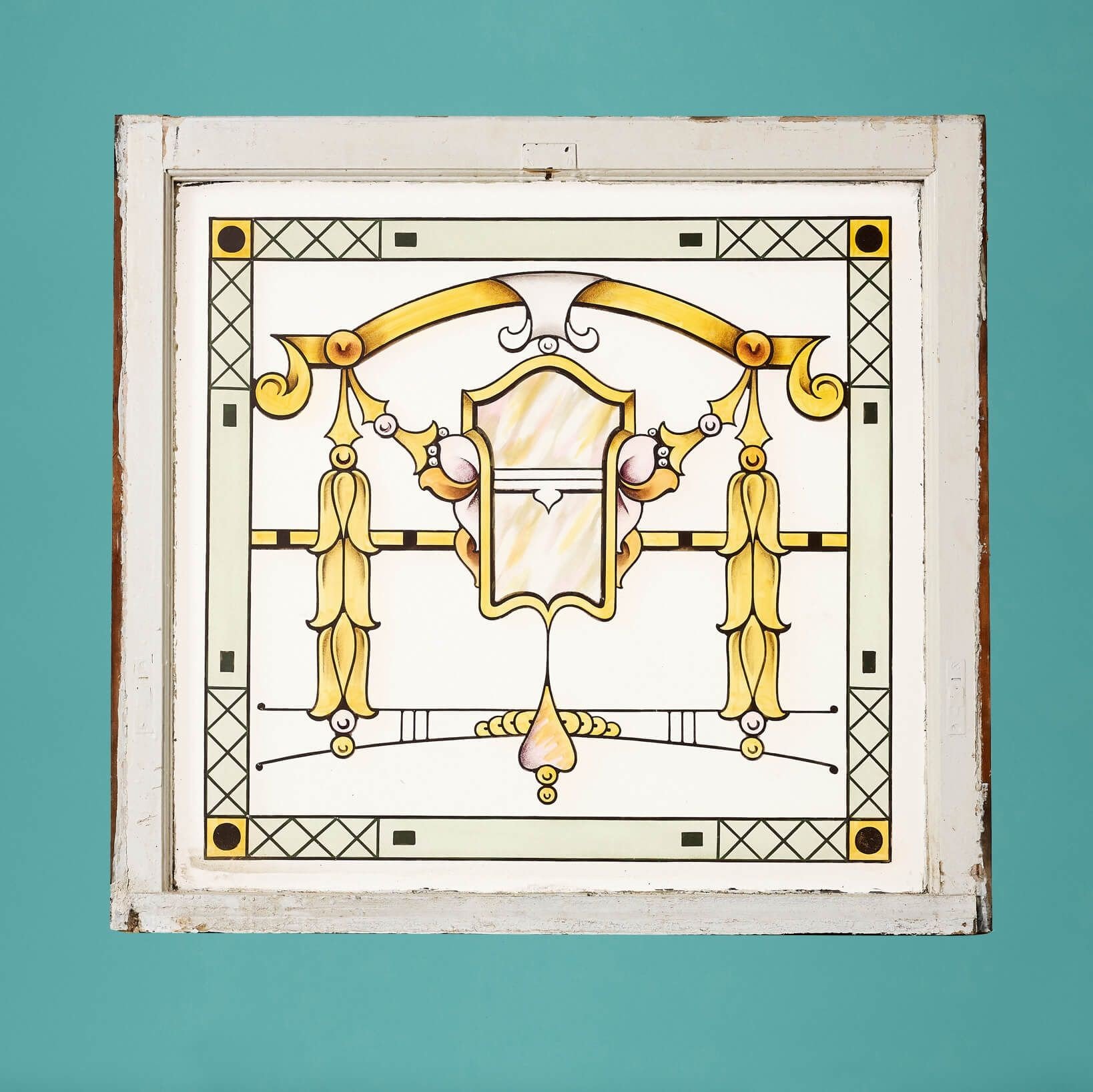 back to topAn early 20th century stained glass window, beautifully etched with Art Nouveau style details.