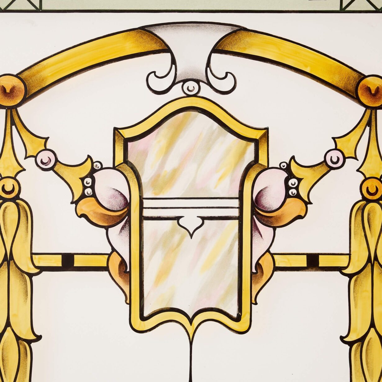 The design is evocative of styling typical of the Art Nouveau period, stained with shades of pale green, pink and vibrant gold, and elegantly etched with intricate arched lines and organic stylised patterns.