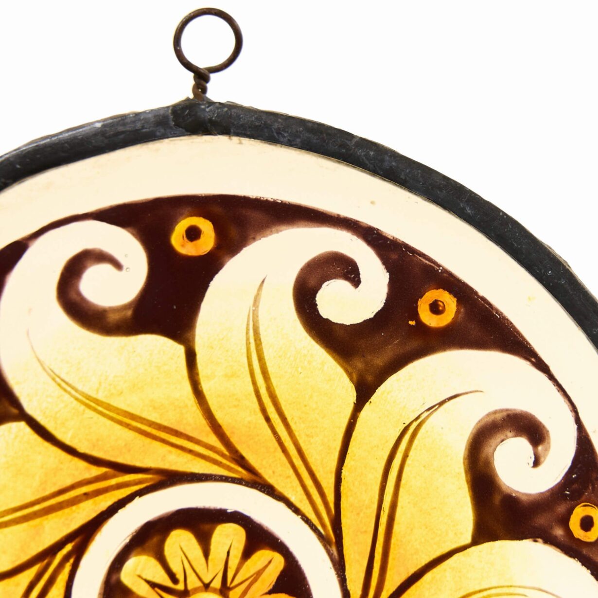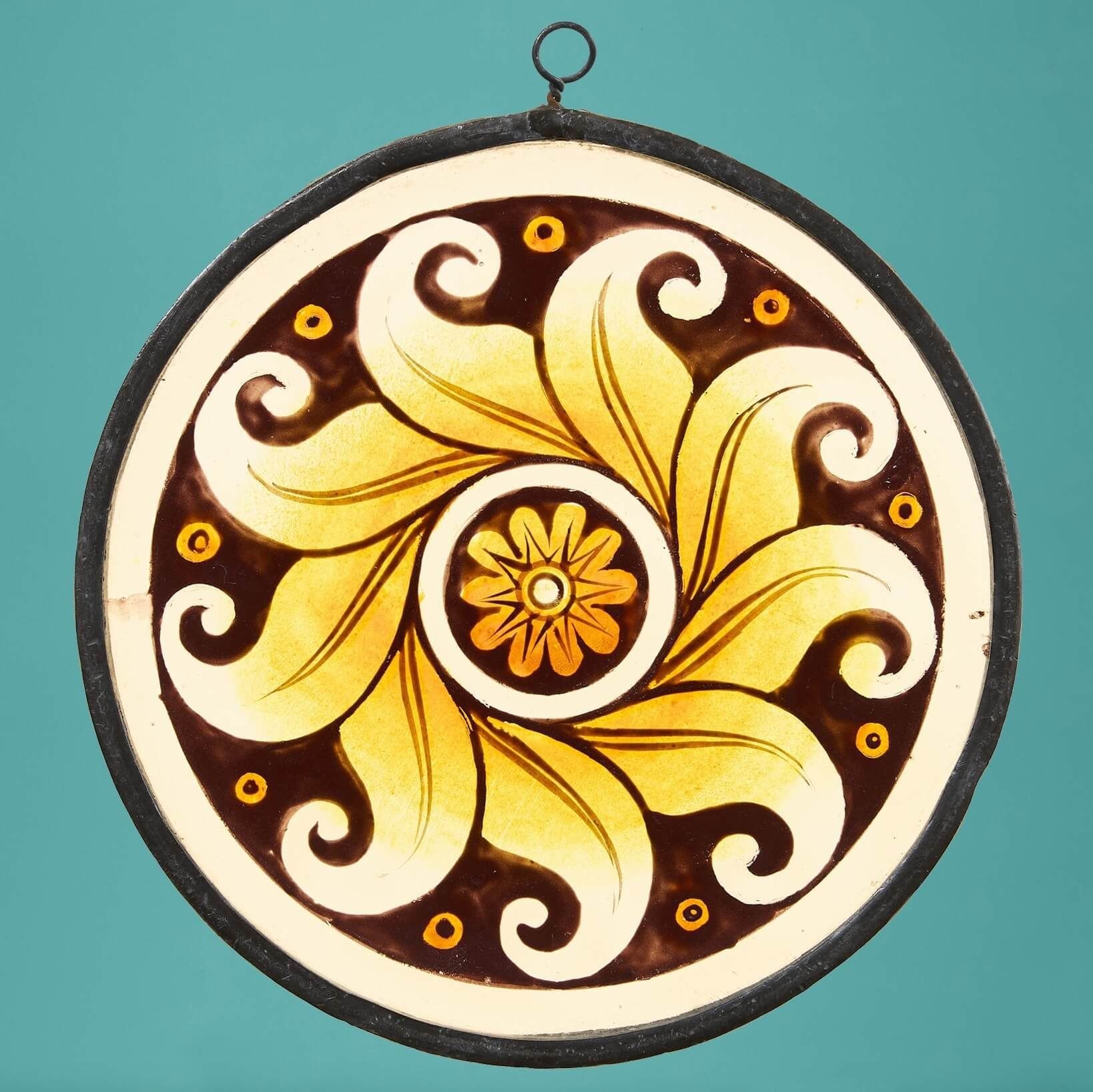 back to topAn arts and crafts late 19th century stained glass panel roundel depicting a stylised sun motif.
