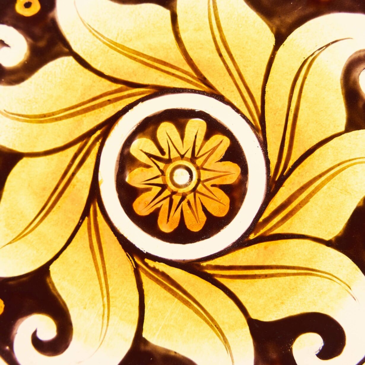 Hand-painted stylised vibrant yellow sun on an ochre ground surrounded by a pale border, highlight the vivid colour of the centre design.