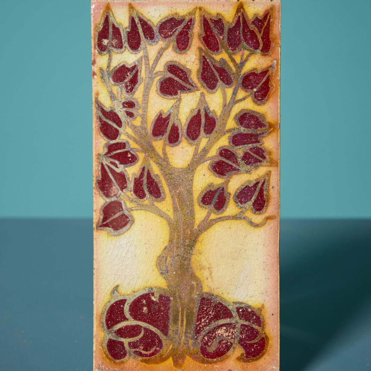 One of four similar in design we have for sale, this antique tile is artistically decorated with a tree of life with rich red leaves, the trunk and branches outlined in a golden lustre glaze.