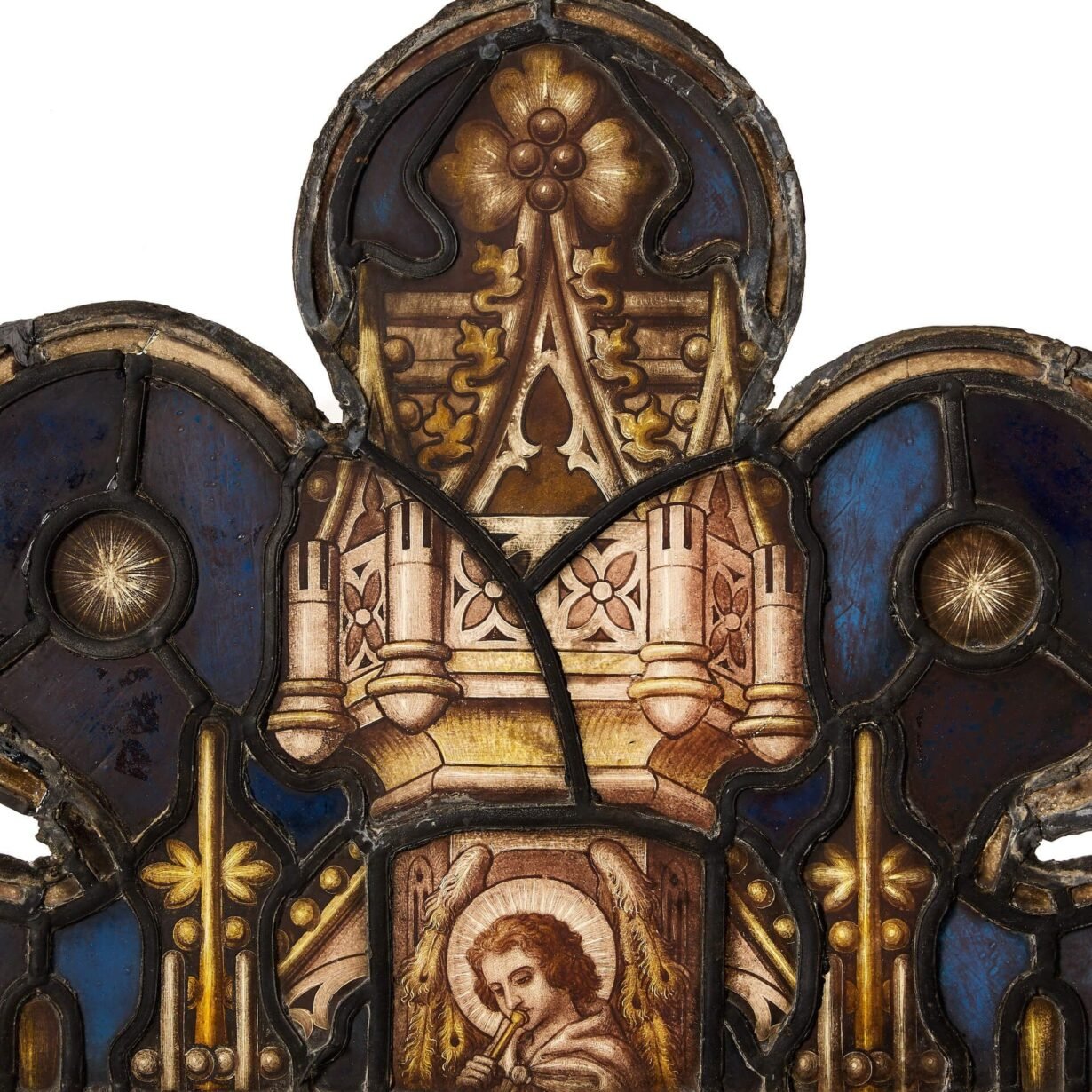 This ecclesiastical window, with ogee panel to the top, details an angel trumpeter before a rich blue stained glass backdrop, above an archway and Gothic architectural columns.