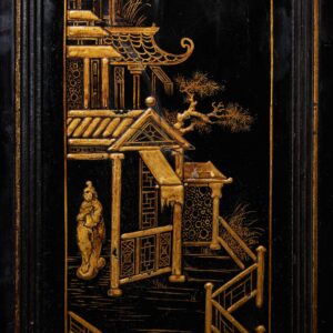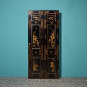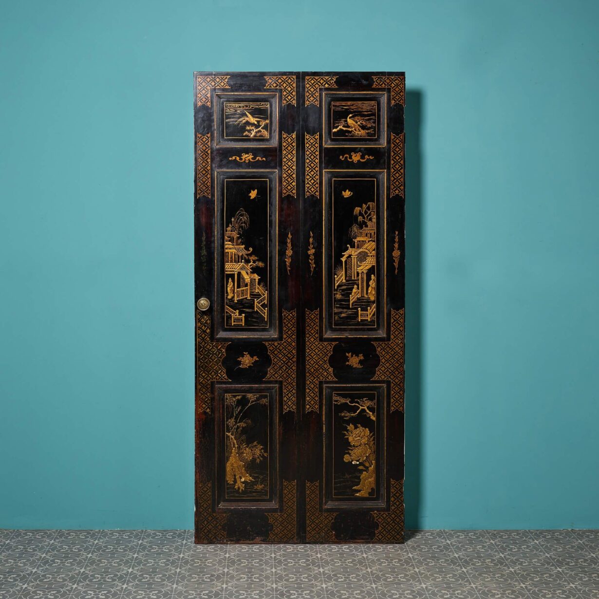 With its 6 panels to one side and angular proportions, this impressive Japanned mahogany door looks as at home in a period townhouse as it does a more modern setting. The black gloss finish is finely hand painted with a range of Chinoiserie inspired motifs and oriental scenes including figures, buildings and trees.