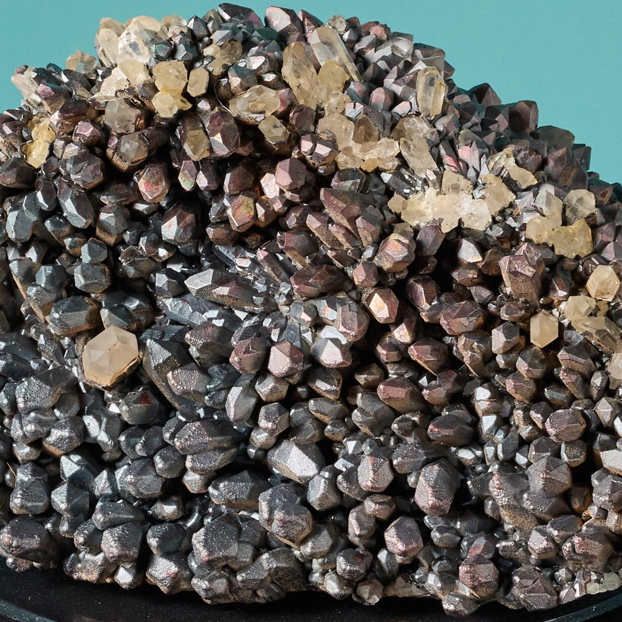back to topAn unusual blacknite quartz cluster specimen with covelline and bornite from Ambositra, Madagascar, presented on one of our museum-quality painted plaster bases.