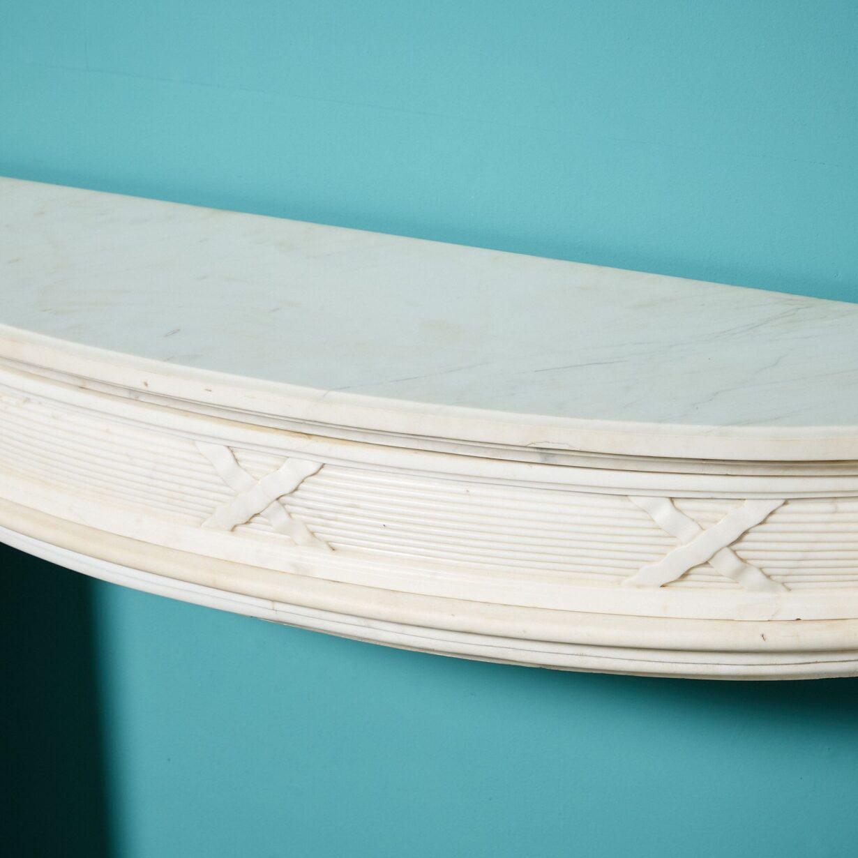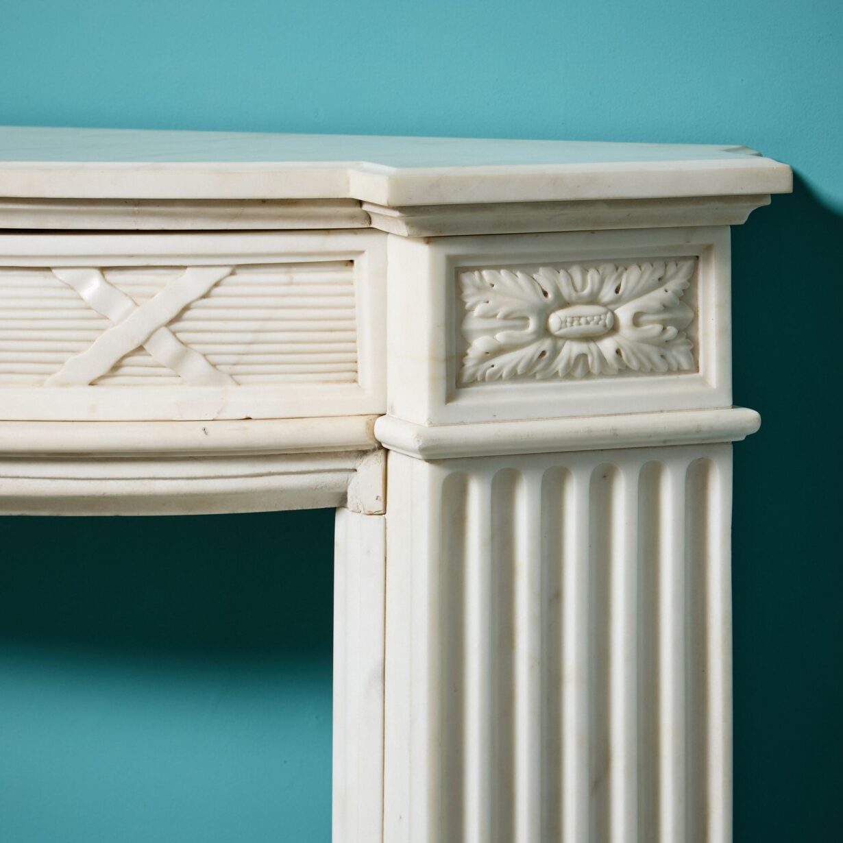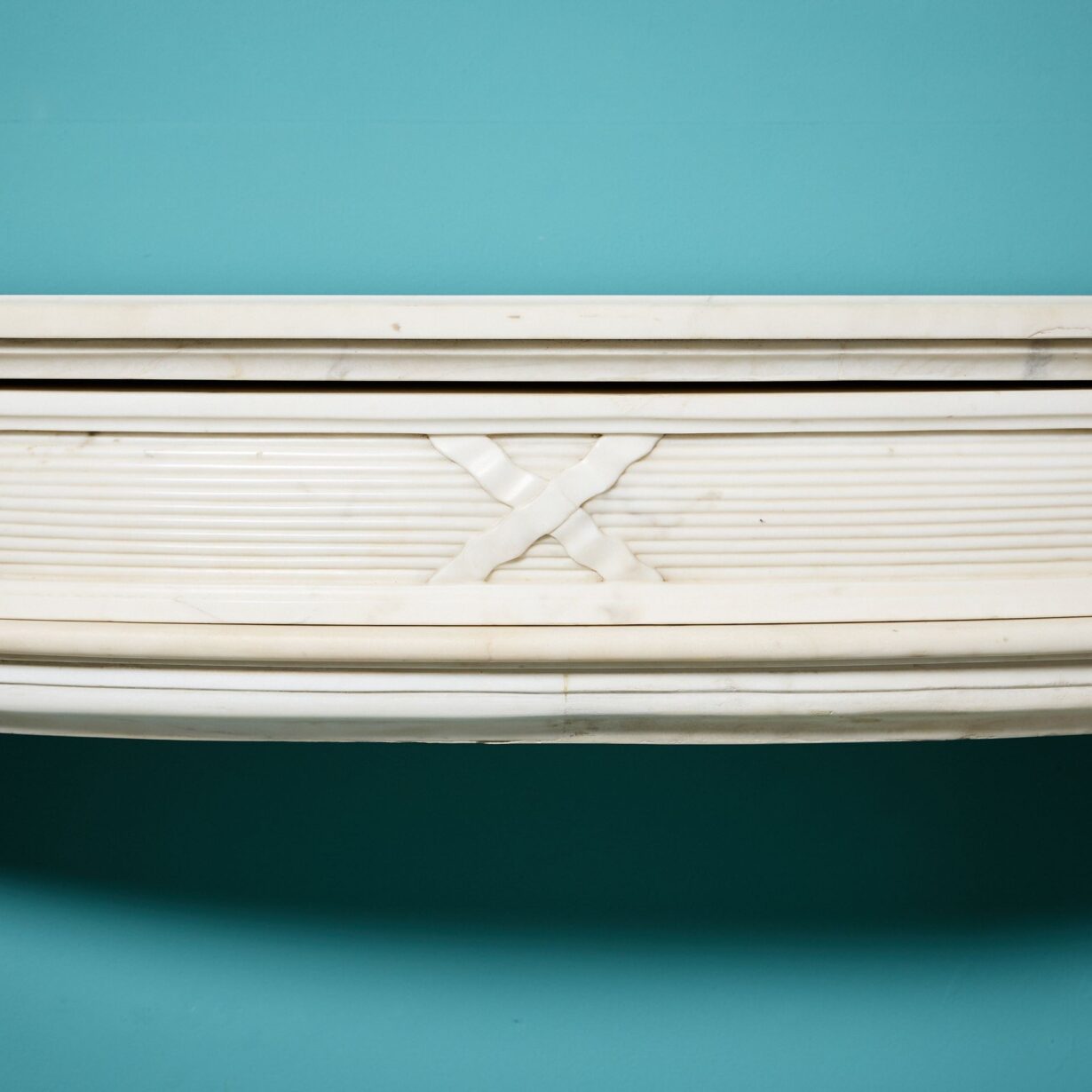 back to topThis stunning antique white marble fireplace dates from the mid 1800s. Made entirely from statuary white marble, it is petite in scale with a curved bowfront rarely seen in antique fireplaces of this era. A mix of styles is present, showcasing distinctly English jambs alongside a finely decorated curved frieze that nods to classical French styles. Fine carving throughout adds to its elegance and grandeur, sitting proudly at the heart of any room. A Georgian-French fireplace of effortless beauty, it can be used to complement a period property or situated in a more modern setting as a historic focal point.
